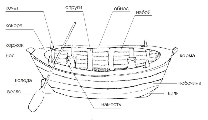 Казалось бы, элементы одни и те же — матица (киль), кокоры (шпангоуты), штевни (конструкции в носу и корме судна, к которым примыкает его наружная обшивка), но геометрия везде своя. Она диктуется характером водных просторов. Для Онежского озера с его короткой злой волной характерен высокий штевень, острый нос и развал бортов. На лесных озерах Плесецкого района строили дубаны — узкие осиновые долбленки, похожие на индейские каноэ. Иногда их сцепляли попарно нагелями (деревянными штырями), получая устойчивый катамаран для рыбалки.