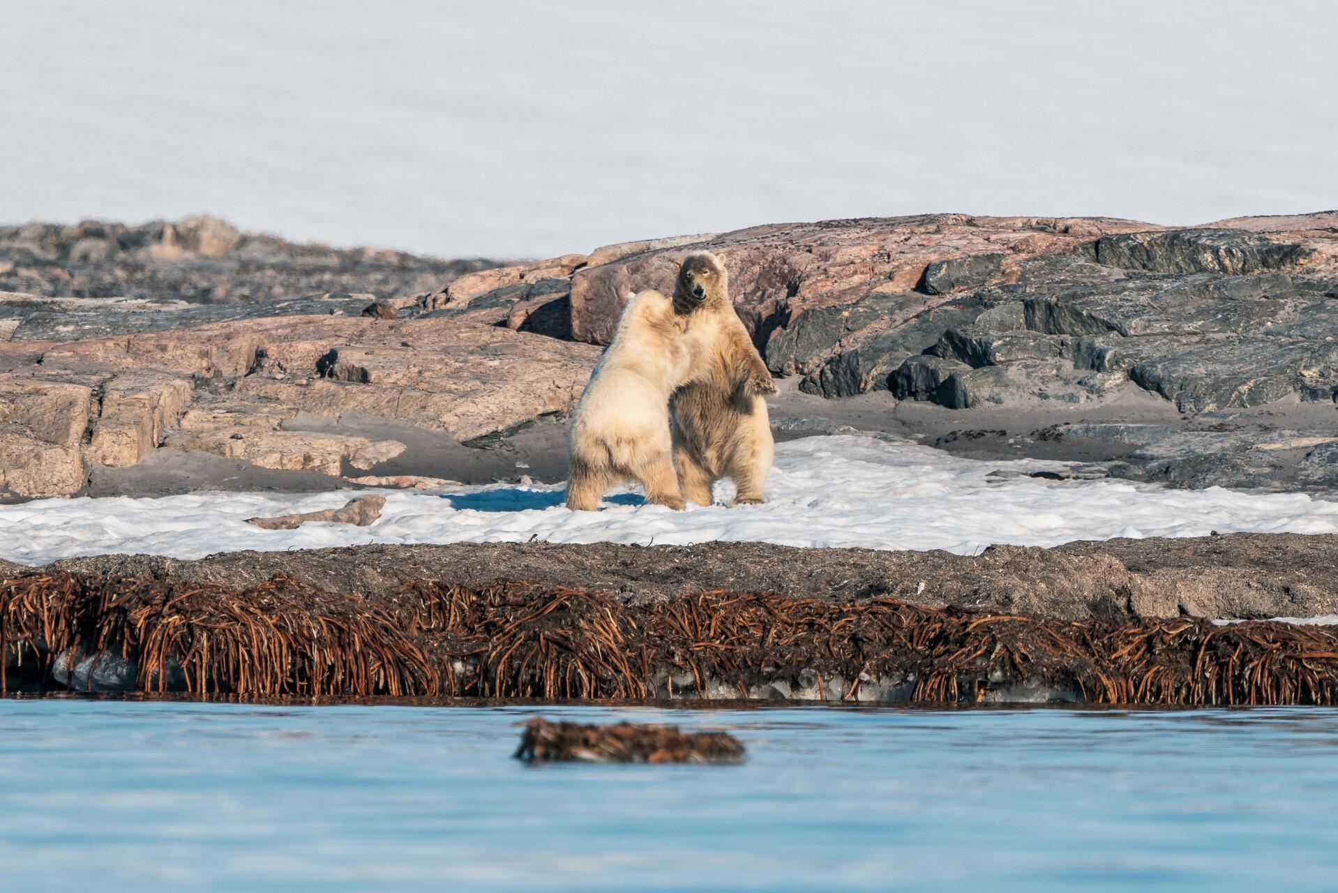 А чтобы во время высадок на берег мишки не проявляли излишнее любопытство, группы всегда сопровождает вооруженная команда гидов, чтобы обеспечить безопасность и людей, и зверей. Жители городка Лонгйир на Шпицбергене раньше всегда должны были иметь при себе оружие, но следовали негласному правилу: «В наш супермаркет белые медведи не заходят — оставьте ружье на входе». Для этого у дверей магазинов даже стояли специальные ящики. Сейчас медведи предпочитают держаться подальше от людей и уходят в северную и восточную части острова.