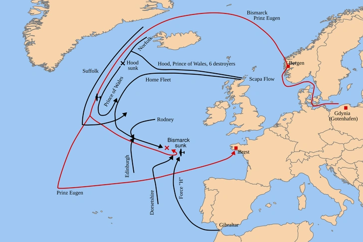 Недолгая боевая история линкора «Бисмарк» началась 18 мая 1941 года, когда он и «Принц Ойген» покинули Готенхафен (ныне польский порт Гдыня). Вместо того чтобы проследовать в Северное море через Кильский канал (это заняло бы больше времени, но могло отсрочить обнаружение соединения), был выбран короткий маршрут через проливы Каттегат и Скагеррак.