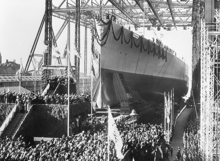 14 февраля 1939 года 60 тысяч зрителей стали свидетелями торжественной церемонии спуска линкора на воду. В присутствии выступившего с речью Гитлера Доротея фон Лёвенфельд, внучка первого канцлера Германской империи Отто фон Бисмарка по традиции разбила бутылку шампанского о борт корабля и произнесла: «Именем фюрера я нарекаю тебя „Бисмарк“».