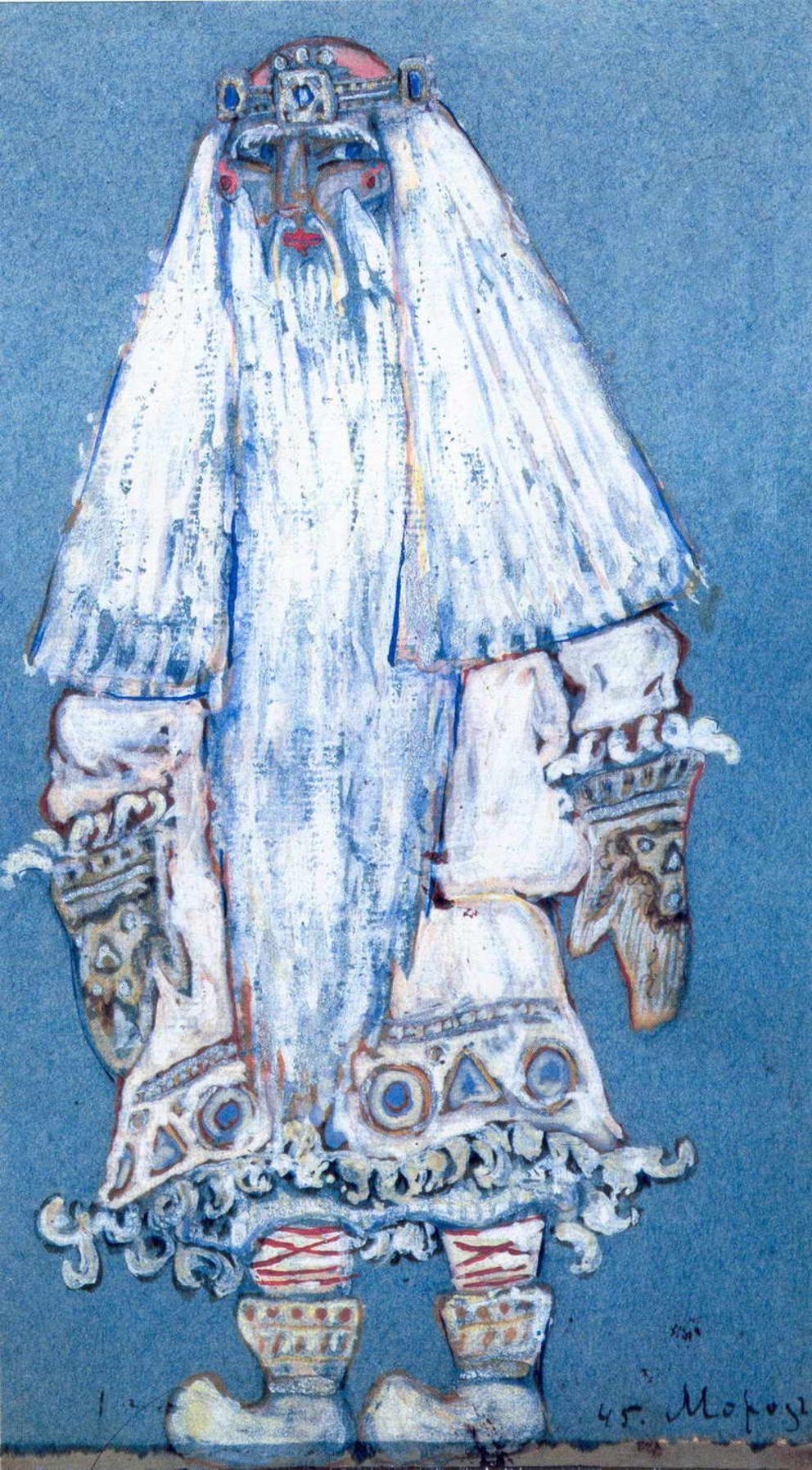 Выполняя декорации к «Снегурочке», Васнецов написал и «Мороза» — сурового хозяина русской зимы, одетого в белую рубаху, крестьянские штаны и лапти.