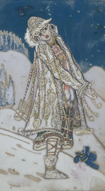 Совсем другим получился Дед Мороз у Николая Рериха, подготовившего эскизы костюмов для постановки пьесы «Снегурочка» в драматическом театре «Рейнеке» в 1912-м. Лукавый худенький старичок в костюме, перекликающимся с нарядами жителей Русского Севера еще дохристианских времен, выглядит менее строгим, чем васнецовский Мороз, но точно не уступает ему в смекалке и хитрости. Тогда же Рерих сделал эскиз костюма Снегурочки.