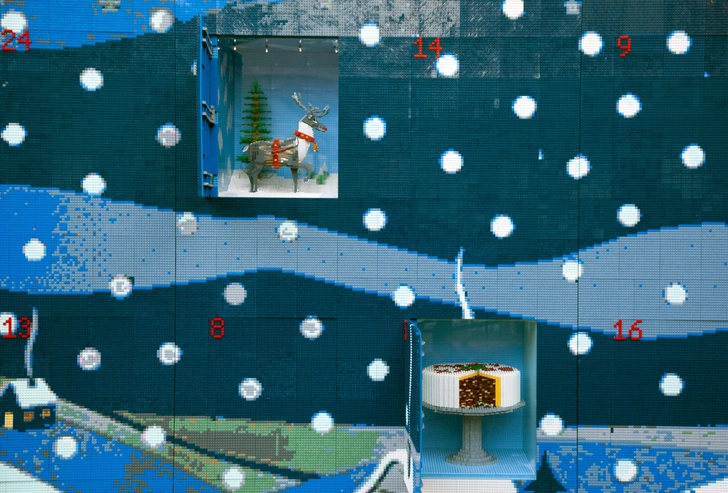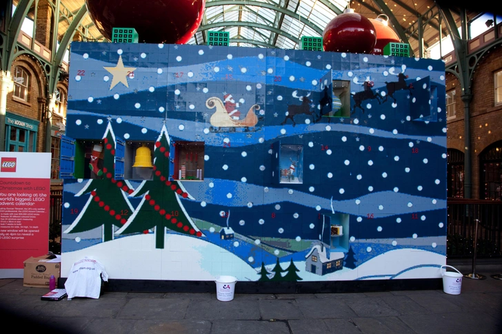 В 2012 году на рынке Ковент-Гарден в Лондоне британский художник Данкан Титмарш построил адвент-календарь — мечту любого поклонника конструктора Lego. Для создания календаря высотой 5 метров и шириной 3 метра потребовалось более 600 тысяч деталей и семь недель кропотливой работы. Как и положено, на календаре были окошки, которые каждый день открывали приглашенные гости на глазах у публики. После церемонии открытия детям раздавали подарки. Представьте только масштаб работы — каждая деталь конструктора была установлена вручную.