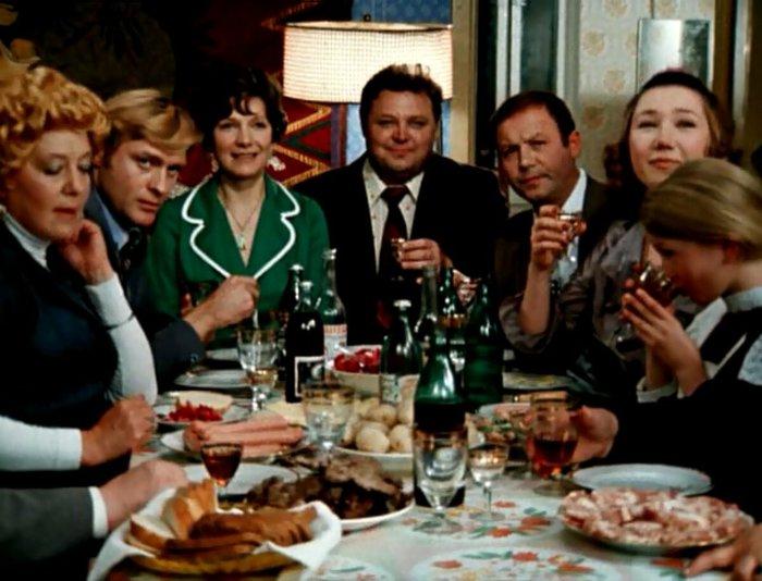 Помимо одного-двух салатов и традиционного холодца, на столе часто присутствовали котлеты, тушеное мясо, жареная курица, буженина и сибирские пельмени. В число деликатесов, «достать» которые было сложнее всего, входили икра и шпроты, а ближе к концу советской эпохи — финский сервелат, консервированные ананасы и оливки.