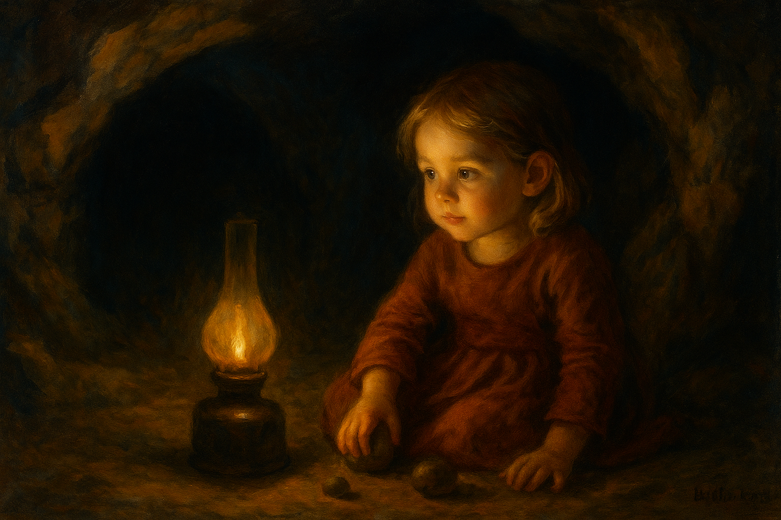 «Я хотел убедиться, была ли эффективной моя система воспитания ребенка. Я всегда старался дать ей возможность свыкнуться с темнотой и ничего не бояться. Ей никогда не рассказывали сказок про волков, разбойников, фей и не говорили других глупостей, которые делают детей боязливыми. <…> Конечно, я оставил рядом с ней зажженную лампу, показал ей, как играть, делая шарики из глины, причем сам сделал несколько штук, и после этого вышел из пещеры, чтобы вернуться через четверть часа», — писал Кастере.