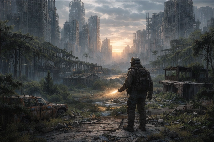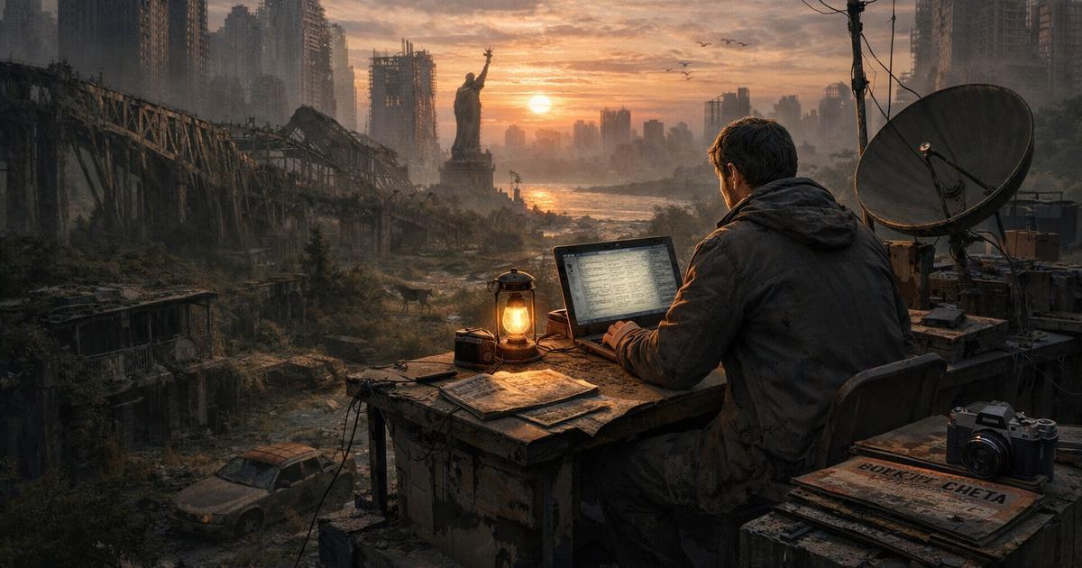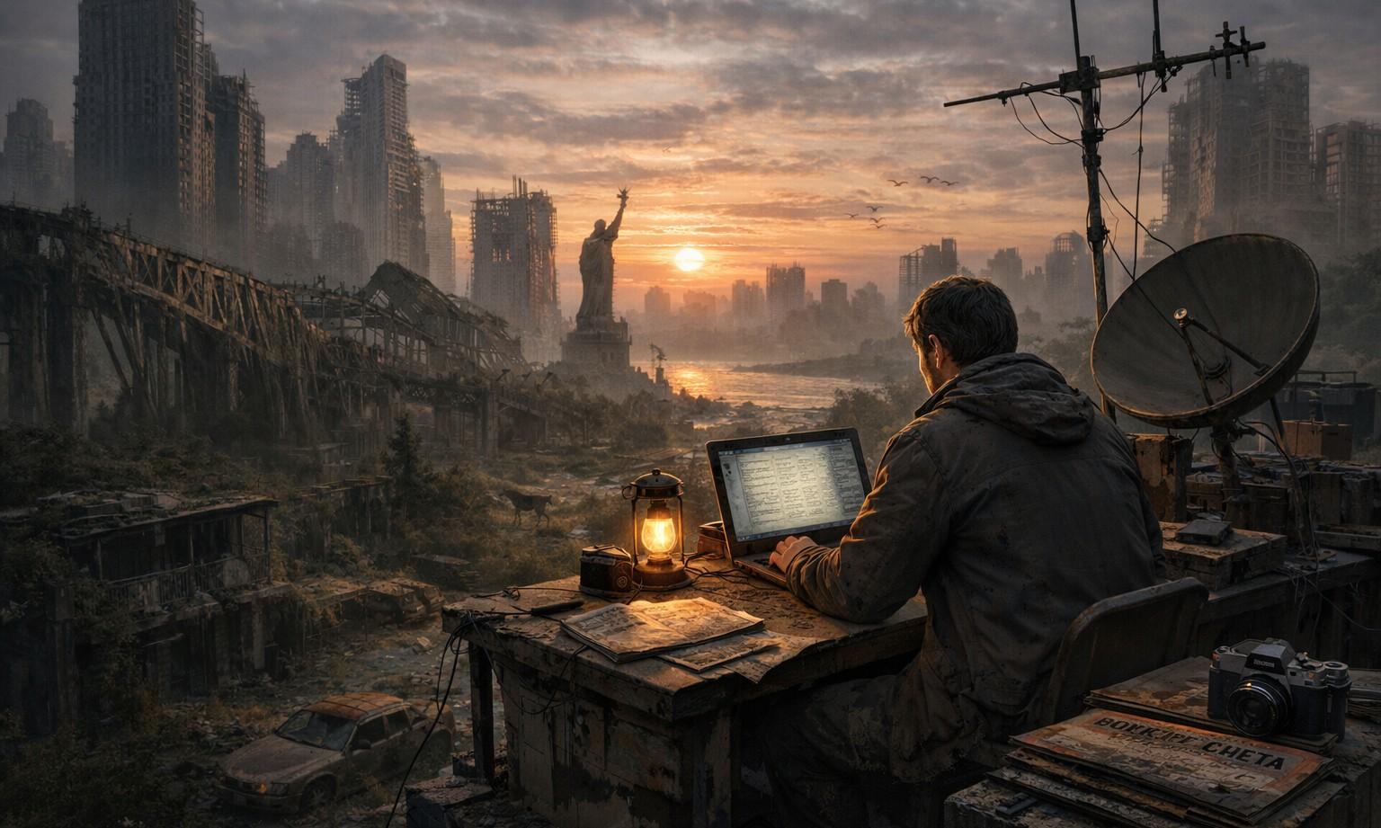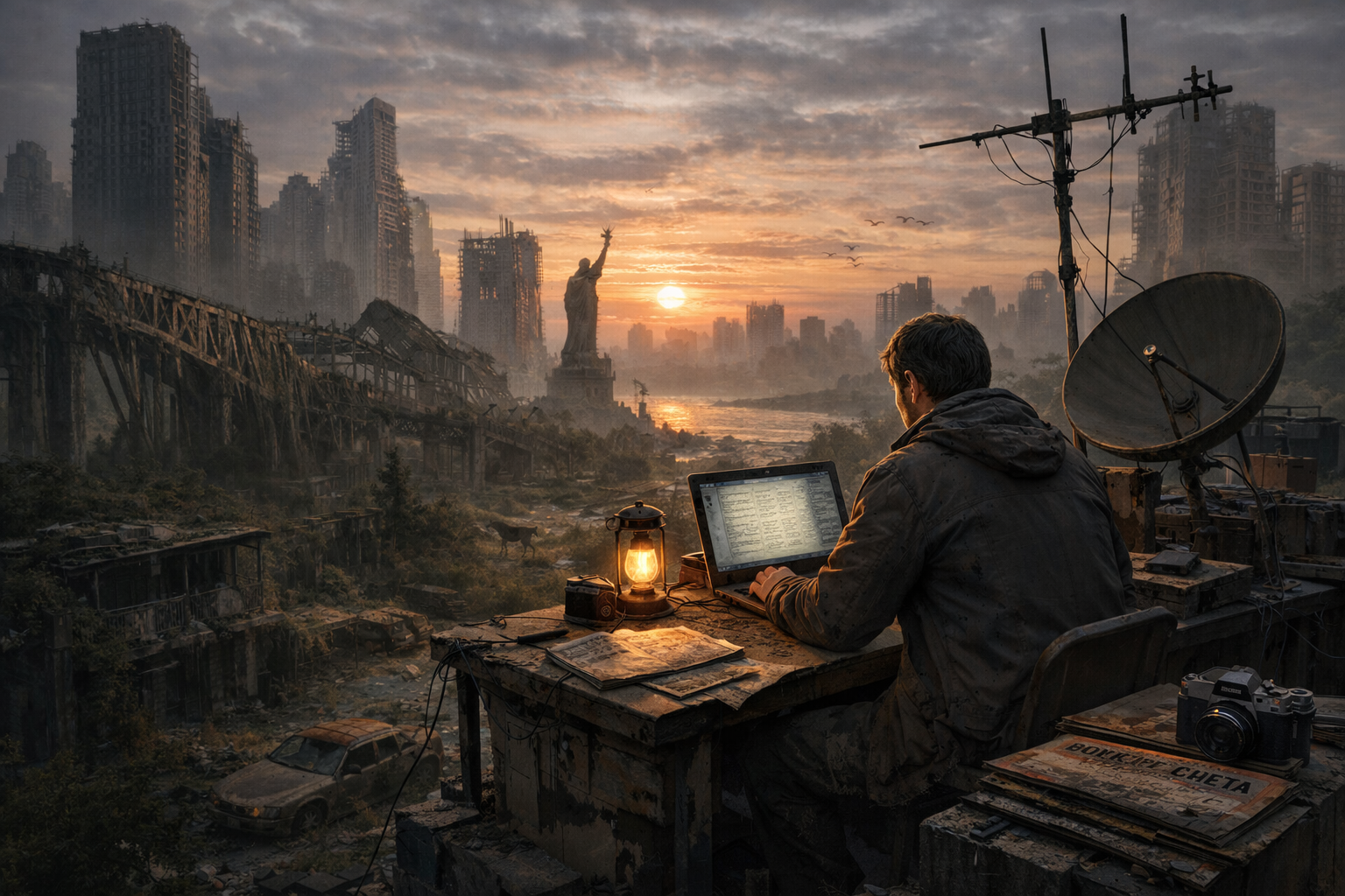 Редакция — это он сам плюс миллиарды ИИ-фрагментов сознаний всех предыдущих журналистов, читателей, фотографов. Они помогают ему путешествовать по опустевшему миру: руины Шанхая, заросший Манхэттен, леса на месте Москвы…