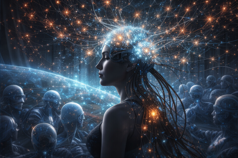 Через 70–100 лет человечество уже частично перешло в пост-биологическую форму. Большинство людей — это либо киборги с полным нейро-контролем тела, либо загруженные сознания в квантовых облаках.
