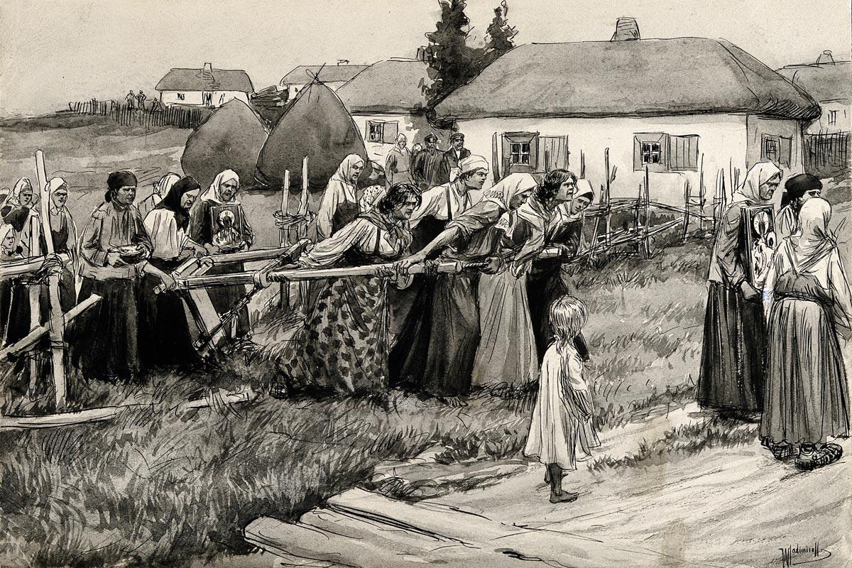 Защищали не только свой дом, но и селение, особенно если сообществу грозила опасность. От бушующей по соседству эпидемии или падежа скота проводили ритуал опахивания деревни: нагие невинные девушки и вдовы впрягались в соху и с песнями, прогоняющими смерть, проводили вокруг села борозду.