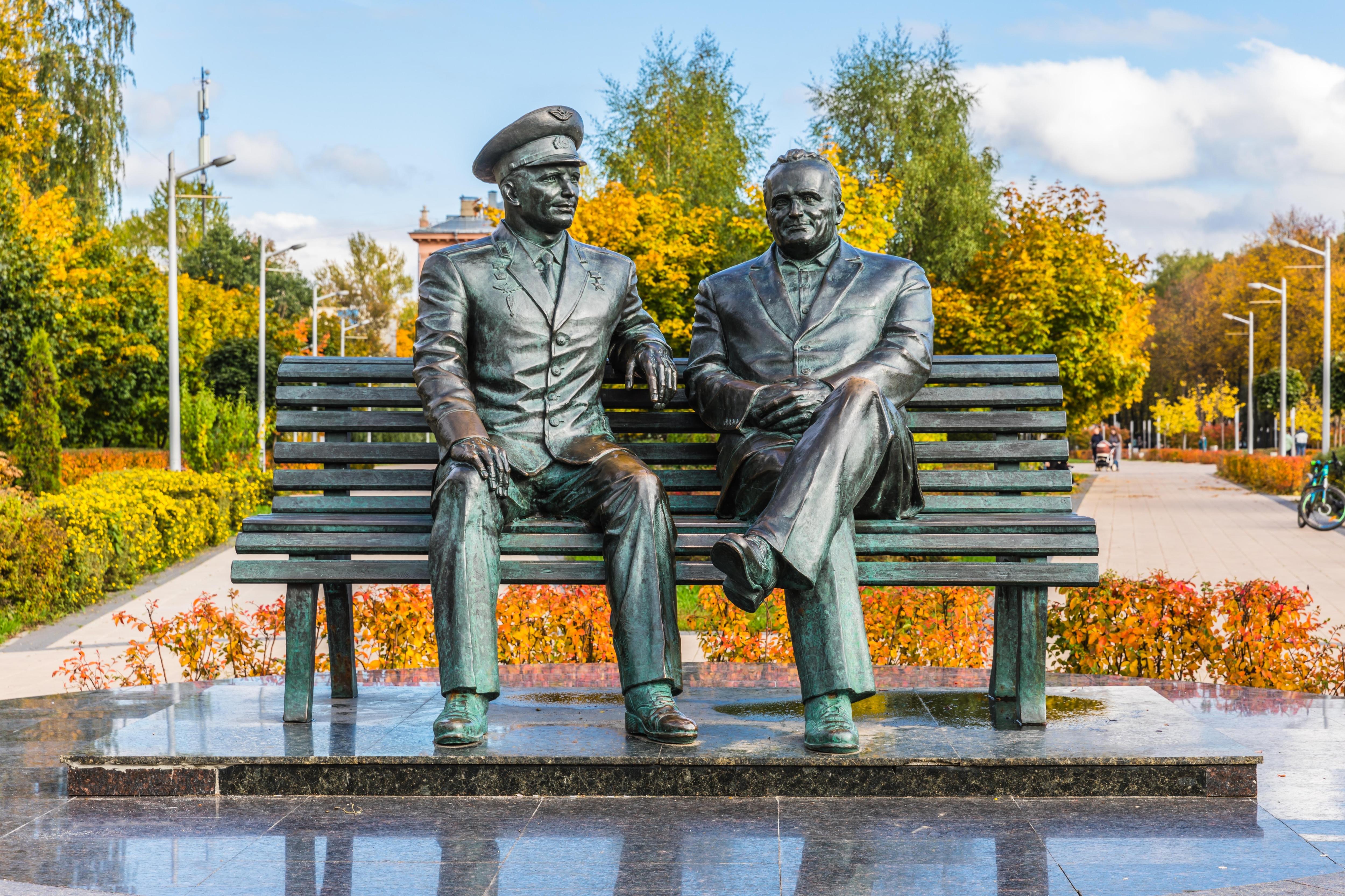 В сквере Покорителей космоса стоит необычный памятник: Королев и Гагарин сидят рядом на скамейке — как будто просто разговаривают. Скульптура сделана по мотивам реальной фотографии 1961 года.