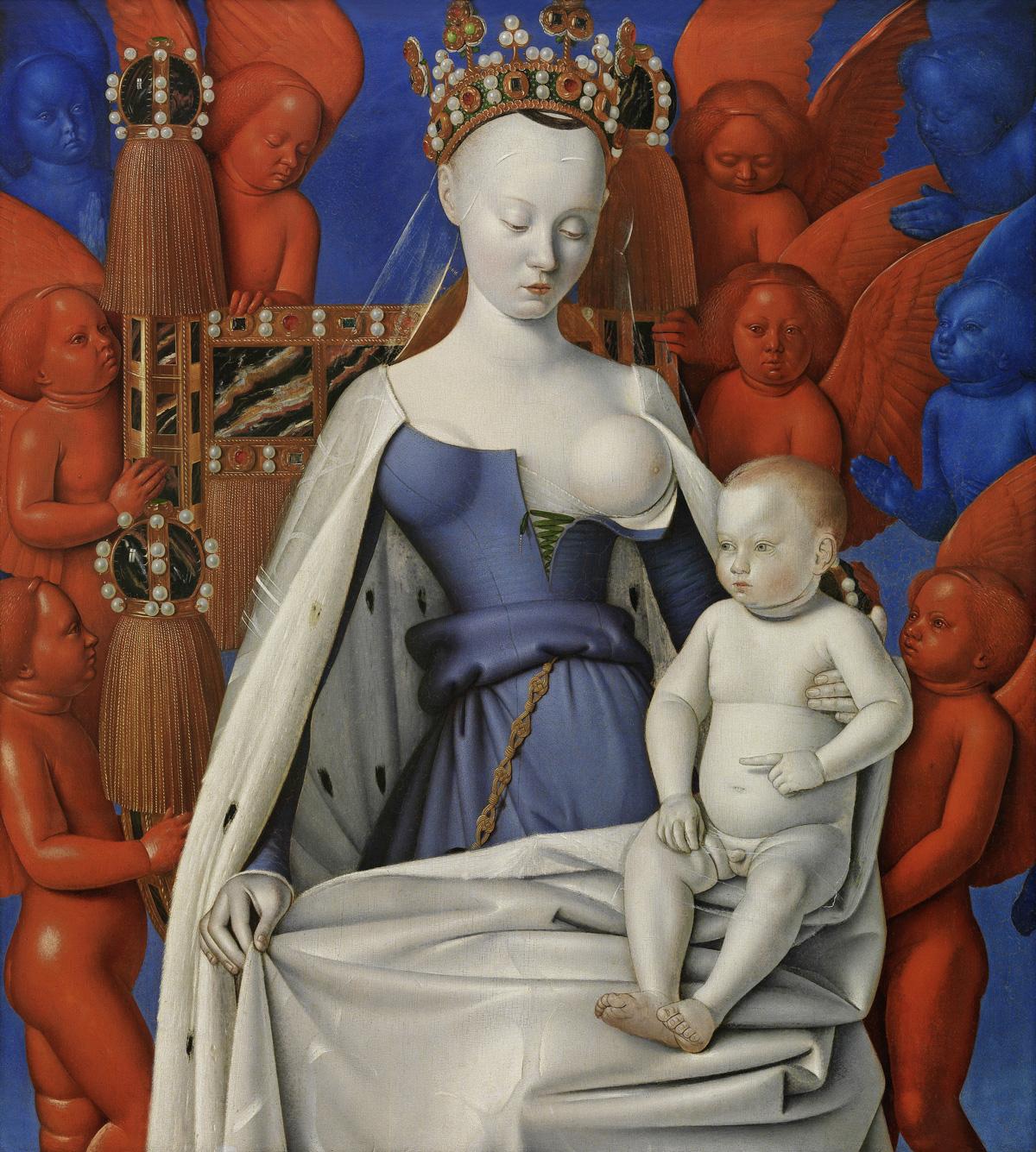 Этот диптих королевский казначей Этьен Шевалье заказал для церкви Нотр-Дам в родном городе Мелёне. На правой створке изображена Богородица с младенцем на троне в окружении ангелов. Считается, что Деве Марии приданы черты Агнес Сорель, фаворитки короля Франции Карла VII.