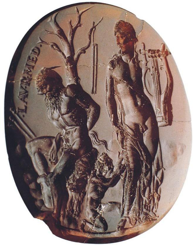 На гемме бог Аполлон собирается заживо содрать кожу с сатира Марсия за то, что тот осмелился вызвать его на состязание в музыке. Если портрет посмертный, то этот сюжет можно трактовать с точки зрения философии неоплатонизма — как освобождение души, ее извлечение из материальной оболочки.
