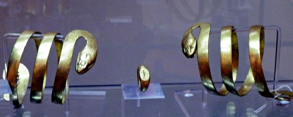 На пальце героини кольцо в виде рукопожатия, а на руке девочки — золотой браслет в виде змеи, и это тоже подлинные вещи жителей античного города. На раскопках найдено много разных браслетов-змеек, но самые похожие на тот, что на картине, — из так называемого «Дома Фавна». Теперь они хранятся в Национальном археологическом музее Неаполя.
