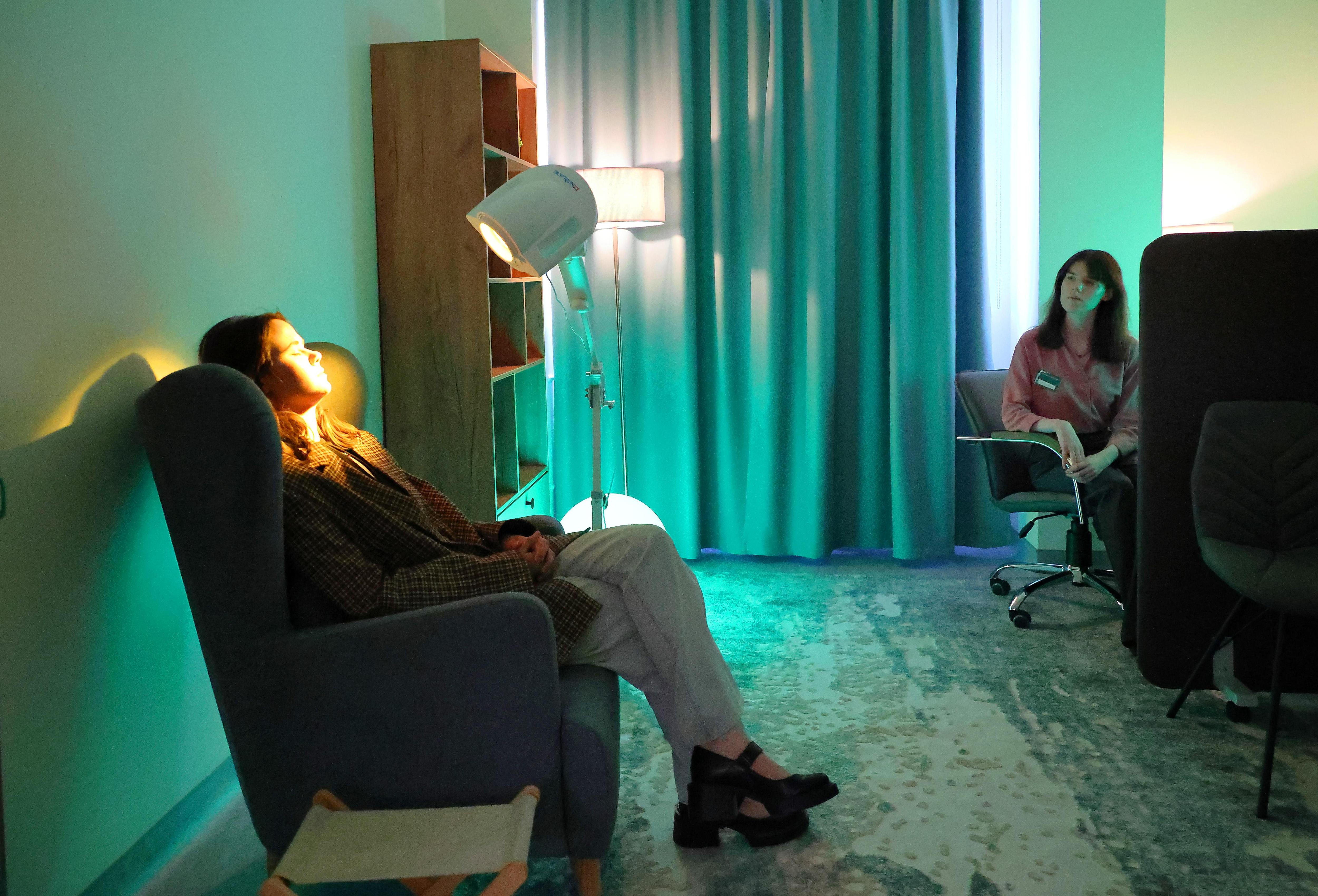 В темном кабинете с плотно задернутыми шторами медицинский психолог Анастасия Дмитриевна проводит сеансы светотерапии. Эту процедуру прописывают при тревоге и раздражительности. Всего 15 минут пребывания под специальной лампой в течение нескольких недель и у человека улучшается глубина и качество сна. Для удобства дают подушку, которую можно подложить под спину, а голову предлагают запрокинуть назад.
