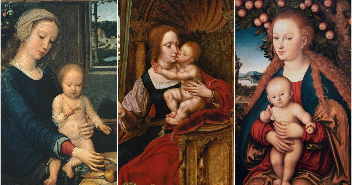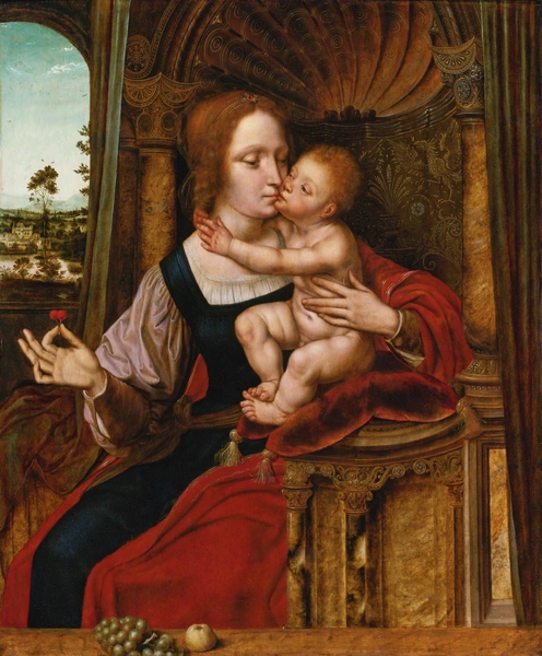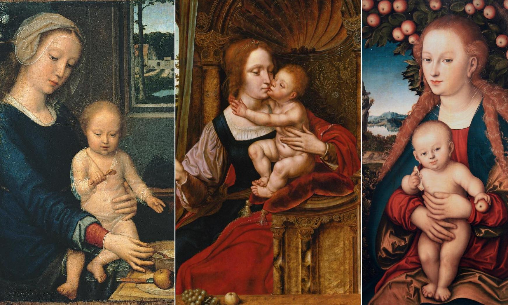Как это часто бывает, название картине дано по самым небольшим ее деталям — двум вишенкам, которые Мадонна держит в правой руке (27). Достаточно представить, что она положила ягоды и обняла сына, как становится ясно: фламандский художник XVI века цитирует старый греческий канон «Богоматерь Елеуса» («умиление»). Эта композиция, пожалуй, даже более трогательная, чем «Мадонна млекопитательница», потому что в близости щека к щеке — только любовь и нежность матери и ребенка.
