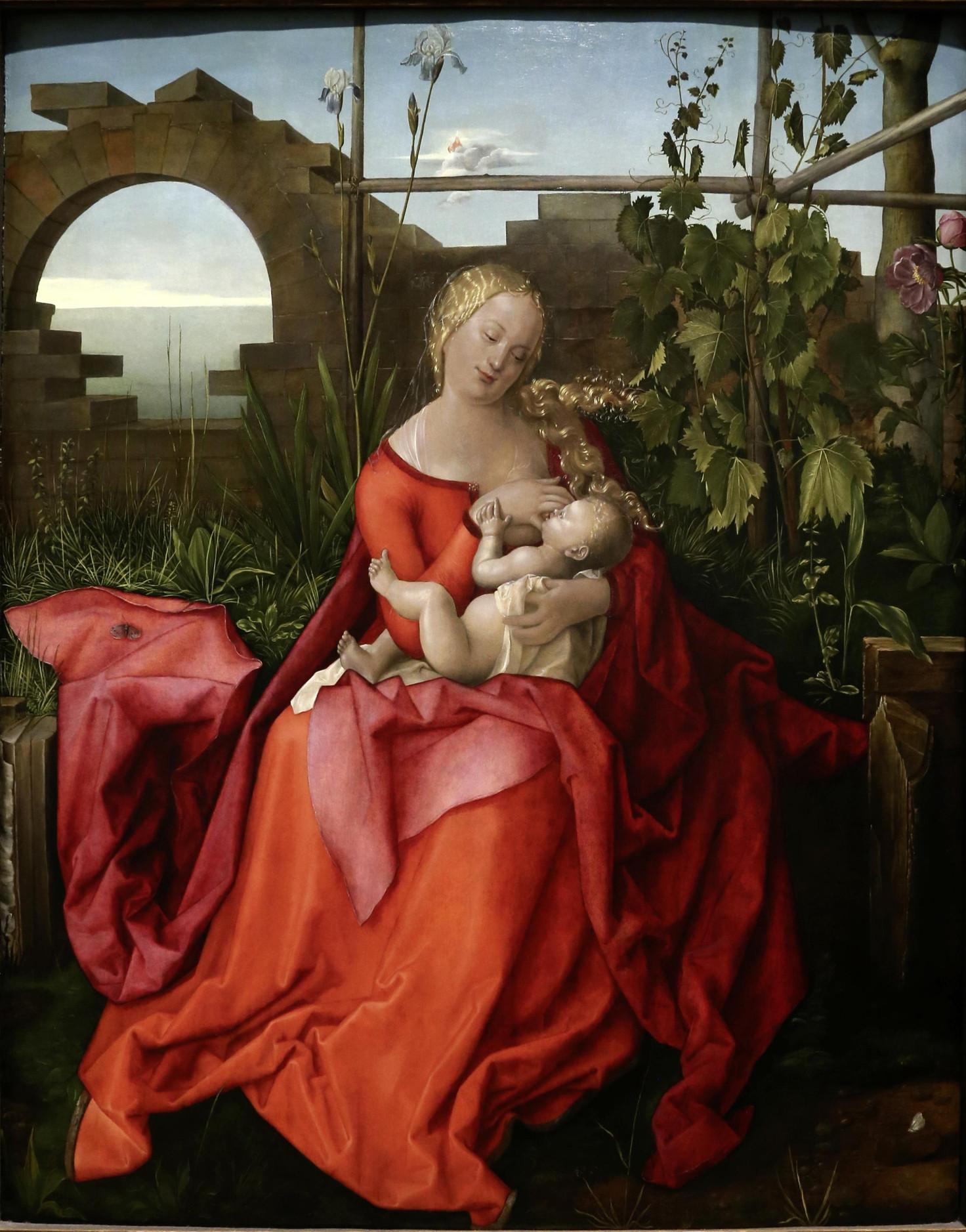 Эту картину, некогда считавшуюся одной из самых эффектных Мадонн кисти Дюрера, все чаще приписывают его мастерской, а на выставке 2019–2020 годов в венской галерее Альбертине ее демонстрировали как работу его ученика Ганса Бальдунга Грина (пусть и со знаком вопроса). В пользу этой версии говорит многое: характерная для Грина работа с разными оттенками красного, узнаваемый тип внешности Мадонны, манера, в которой написаны ее красиво развевающиеся золотые локоны, — но вопрос «кто писал?» все еще открыт.