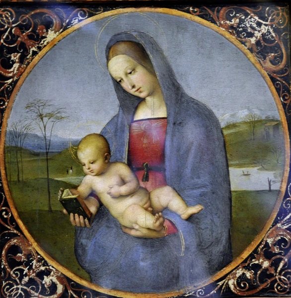 В сюжетах с Младенцем книга (молитвенник, часто открытый на службе, приходившейся на время смерти Христа) (15) — напоминание о его грядущей судьбе. В XV веке эту сцену обычно писали в комнате — за столом или у подоконника, но Рафаэль выводит ее из-под сводов, соединяя с иконографией «Мадонны в саду» и «Мадонны смиренной». Возможно, эта маленькая картина — первая в череде читающих Мадонн кисти Рафаэля (если считать, что фреска в отчем доме художника создана Санти-старшим, тоже живописцем).