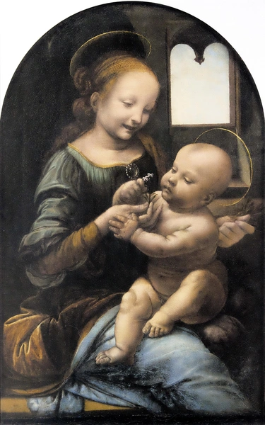 Разочарование Беренсона, вероятно, можно объяснить копотью и слоями потемневшего лака, потому что сейчас отреставрированная «Мадонна Бенуа» вполне юна: улыбающаяся девочка лет пятнадцати, играющая цветком с Младенцем — пухлым и серьезным. Споров об этом цветке (16) чуть ли не больше, чем об авторстве картины. Некогда в нем видели жасмин (белый и непорочный), теперь остановились на расплывчатом «из семейства крестоцветных», что дает разброс от сурепки до левкоев.