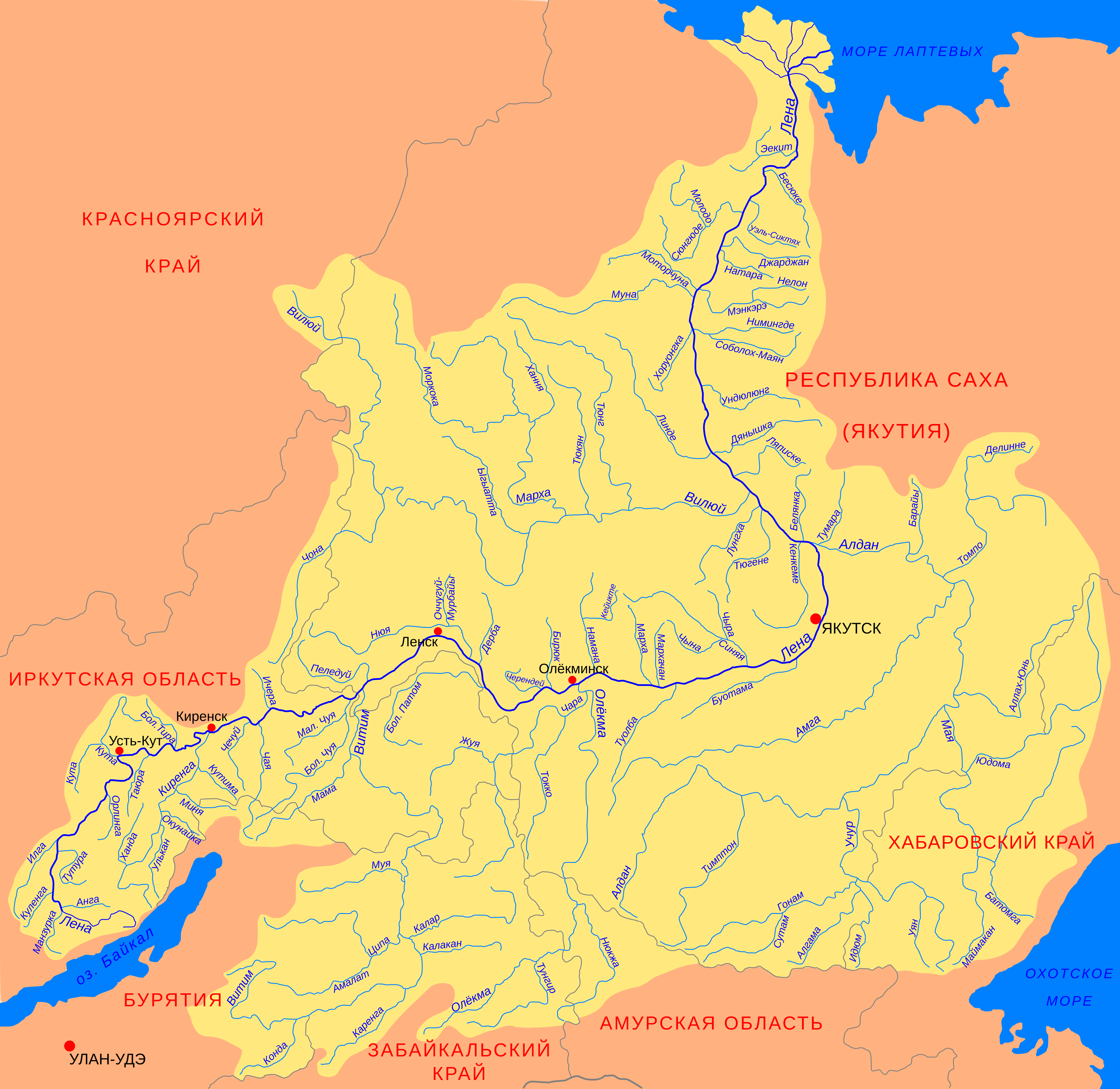 Крупнейшие притоки: Витим, Алдан, Вилюй, Олёкма