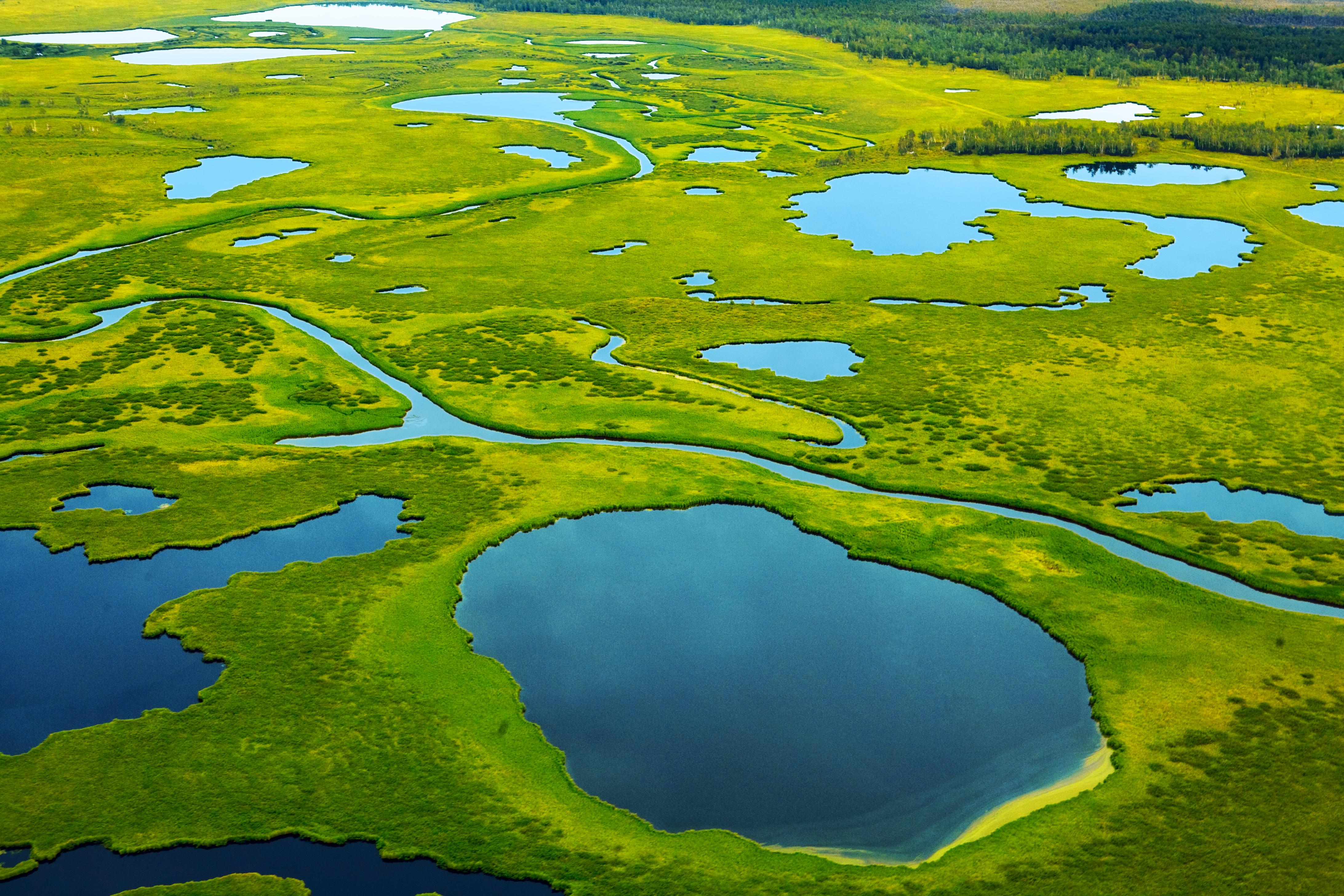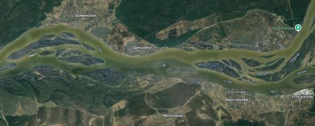 Отсюда река Обь бежит на север через Западную Сибирь и впадает в Обскую губу — крупнейший залив Карского моря.