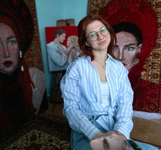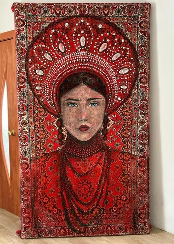 Доминирующий цвет ковровых полотен — красный, как и на самих коврах. Губы, кокошники, бусы, серьги огненного цвета. Материала уходит много, поэтому Лана всегда запасается банками с красной акриловой краской.