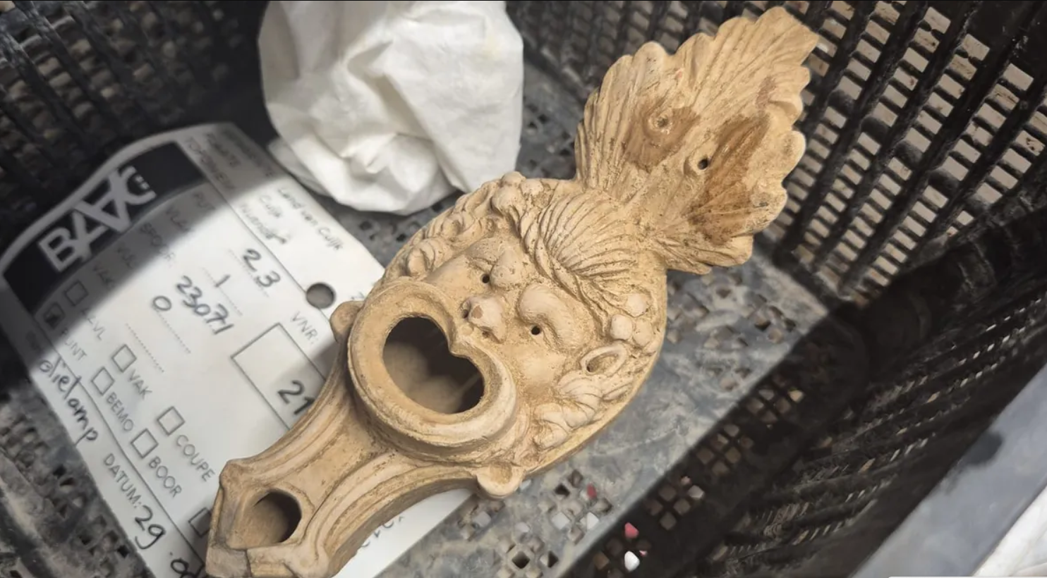 Во время раскопок на обширном римском кладбище в Нидерландах археологи обнаружили необычную масляную лампу, на которой может быть изображен древний бог вина.