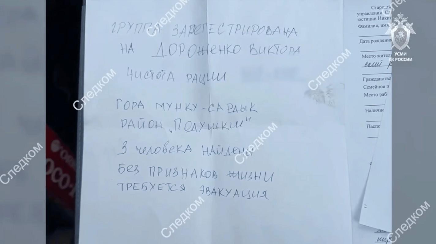 «21 апреля ночью несколько туристов из группы вышли к автомобильной трассе у подножия гор и в придорожном кафе оставили записку, в которой сообщили о гибели во время спуска трех человек, — рассказали следователи. — После этого они поднялись обратно к месту происшествия. Владелец кафе утром передал сообщение, после чего к туристам выдвинулся отряд спасателей».