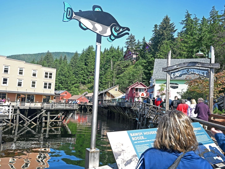 Исторический квартал Кетчикана Creek Street стоит на сваях над ручьем. Еще в первой половине XX века здесь процветал контрабандизм, работали салуны, теперь же туристы прямо с мостков наблюдают за нерестом лосося, пока гиды развлекают их байками из эпохи «сухого закона».
