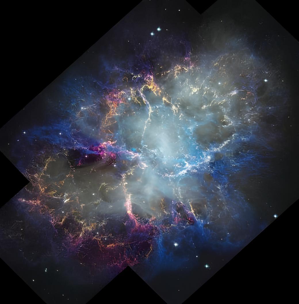 В 2023 году телескоп Джеймса Уэбба (JWST) тоже обратил внимание на Крабовидную туманность и обнаружил ее сердце. Сверхмассивная звезда стала сверхновой и взорвалась около 1000 лет назад, выбросив свои раскаленные внутренности в космос. Но плотное ядро этой звезды осталось нетронутым и представляет собой Крабовидный пульсар, который сегодня живет в центре туманности.