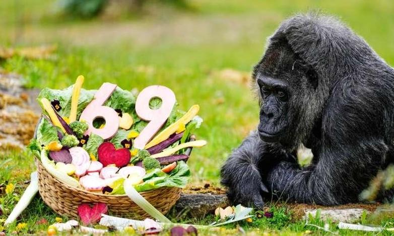 Фату, старейшая в мире горилла, живущая в неволе, отпраздновала свой 69-й день рождения в 13 апреля, полакомившись помидорами черри, свеклой, луком-пореем и листьями салата в Берлинском зоопарке. Никакого праздничного торта, потому что сахар вреден для стареющих приматов.