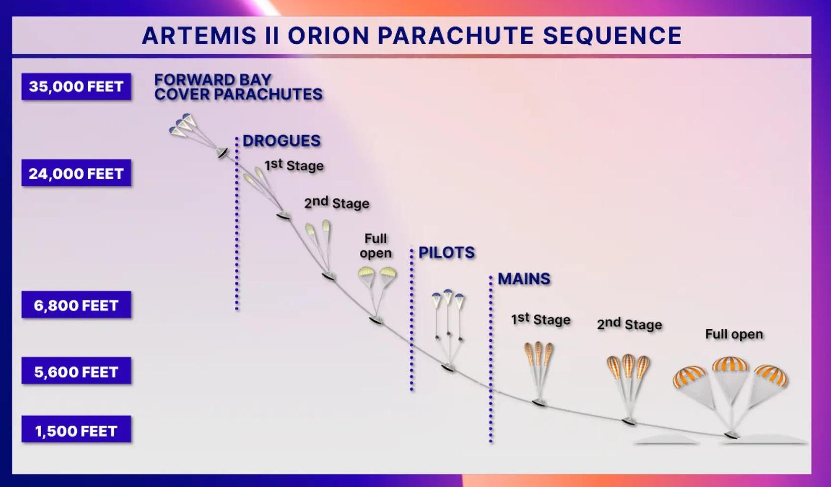 На высоте около 8 километров, когда корабль замедлится до примерно 523 км/ч, наступит черед парашютной системы — всего парашютов на корабле одиннадцать. Сперва пиротехника отстрелит крышку носового обтекателя, которая будет спускаться в океан на трех маленьких парашютах. На высоте 7,6 километра сработают два тормозных парашюта диаметром по 7 метров. Они слегка стабилизируют «Орион» и отсоединятся, после чего на высоте 2,9 километра три вытяжных парашюта выдернут три главных 35-метровых парашюта корабля, с помощью которых «Орион» и должен приводниться у Сан-Диего на скорости около 32 км/ч.
