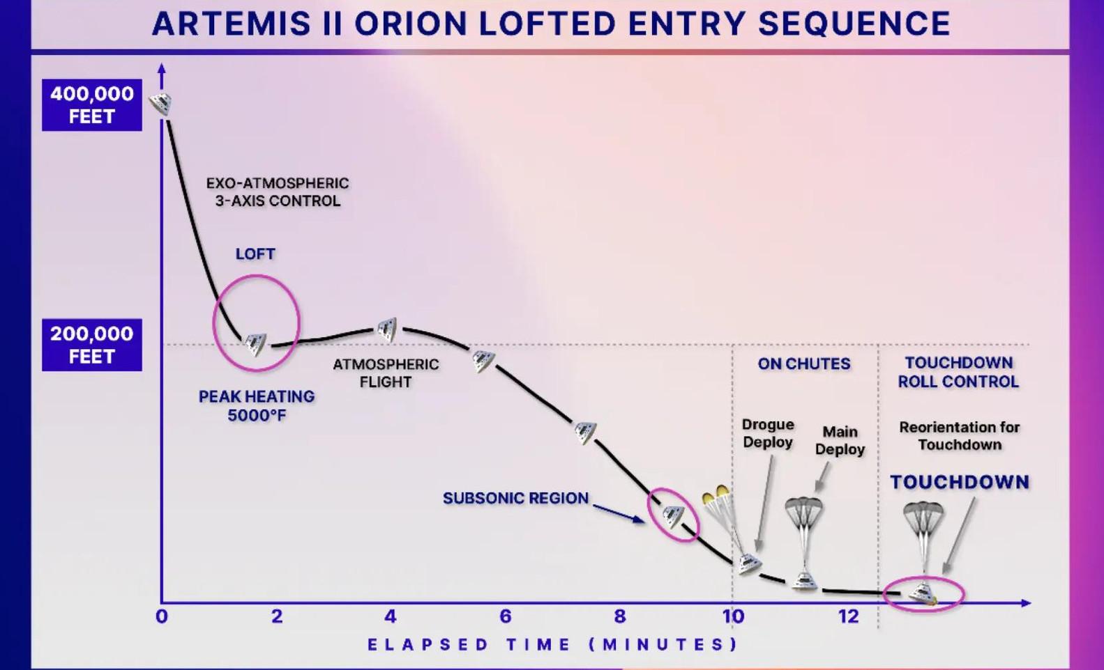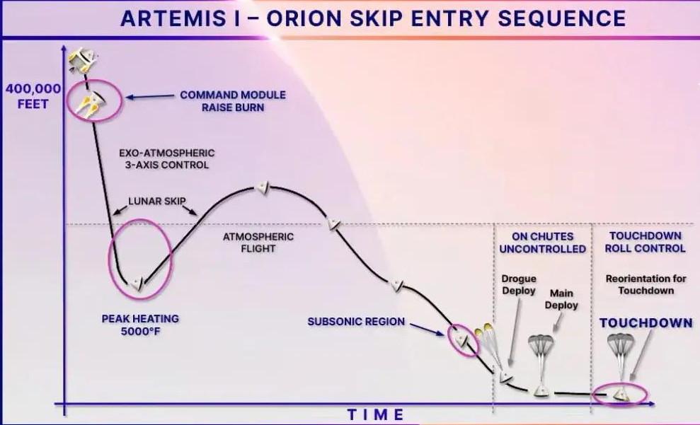 Если во время «Артемиды-1» он сразу совершил глубокий «нырок» примерно до 30-километровой высоты, а потом ощутимо «отскакивал» на 40 километров вверх, то в этот раз корабль войдет в атмосферу под немного другим углом и, достигнув высоты около 60 километров, слегка «подпрыгнет», словно брошенный вдоль воды плоский камушек, после чего начнет снижение по относительно пологой траектории.