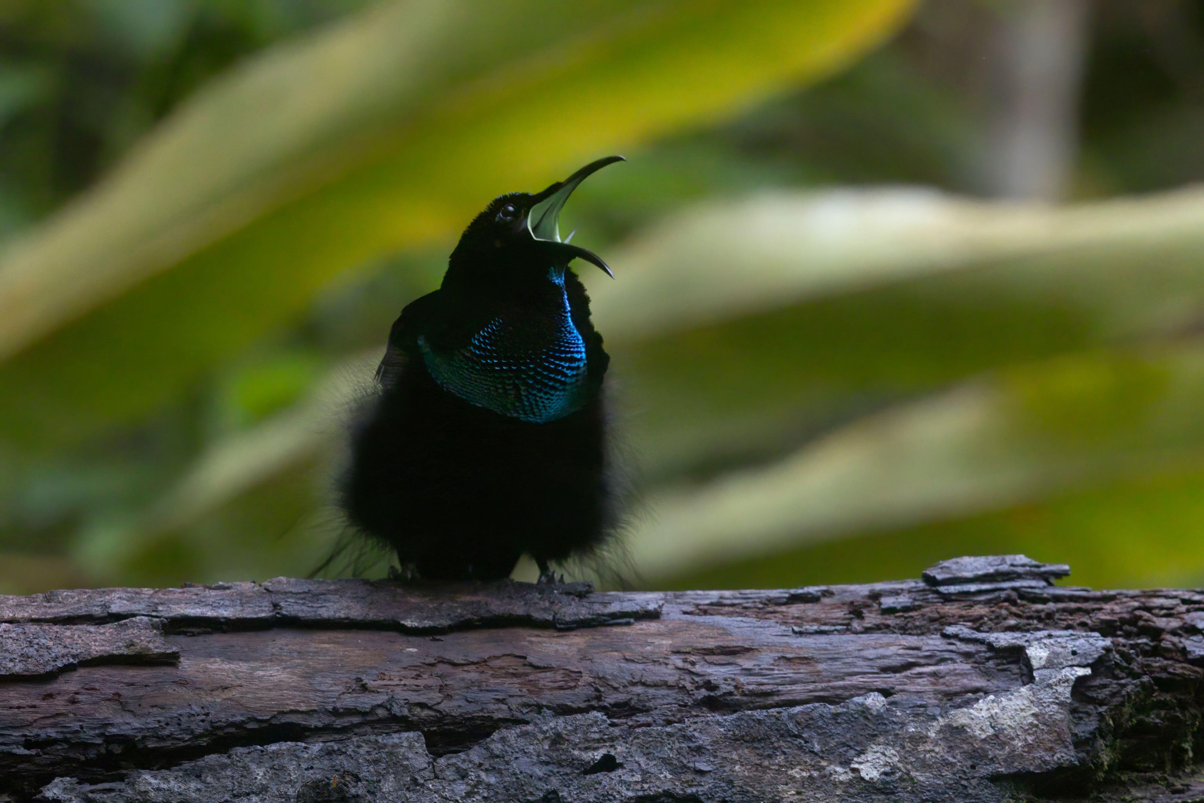Речь идет о великолепной щитоносной райской птице (Ptiloris magnificus), обитающей в тропических лесах Новой Гвинеи и северо-востока Австралии. Самцы этих крупных певчих птиц почти полностью бархатно-черные, с сине-зеленым металлическим отливом на груди, голове и хвостовом оперении.