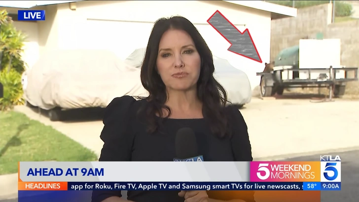 В начале утреннего новостного выпуска репортер KTLA Эрин Майерс анонсировала свой предстоящий репортаж, стоя на подъездной дорожке одного из домов на окраине Монровии, когда позади нее появилось дикое животное.