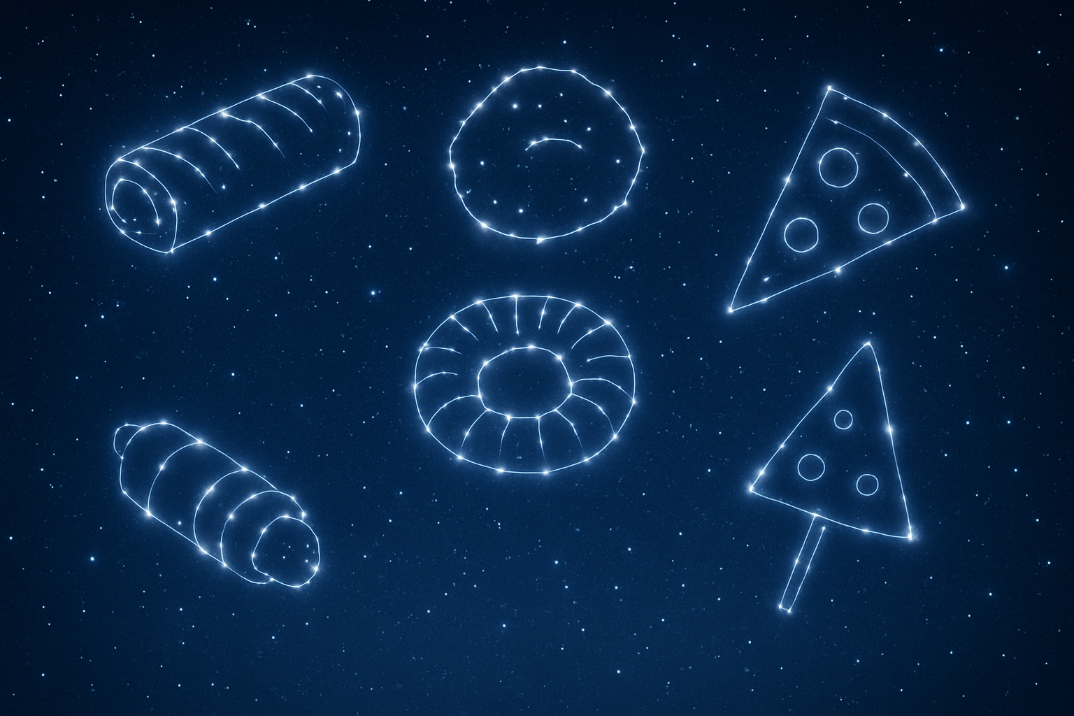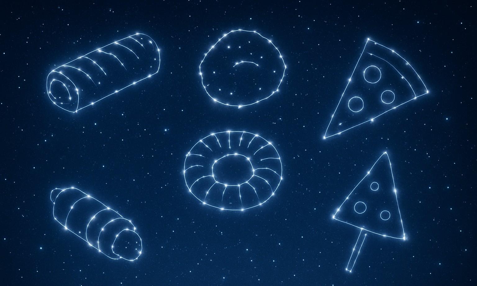 Например, Куриный наггетс — это переработанное созвездие Ориона, где оранжевый гигант Бетельгейзе отмечает «верхний левый угол» наггетса, голубой сверхгигант Ригель — нижний правый, а между ними расположились Беллатрикс, Минтака и другие яркие звезды этого знаменитого созвездия.