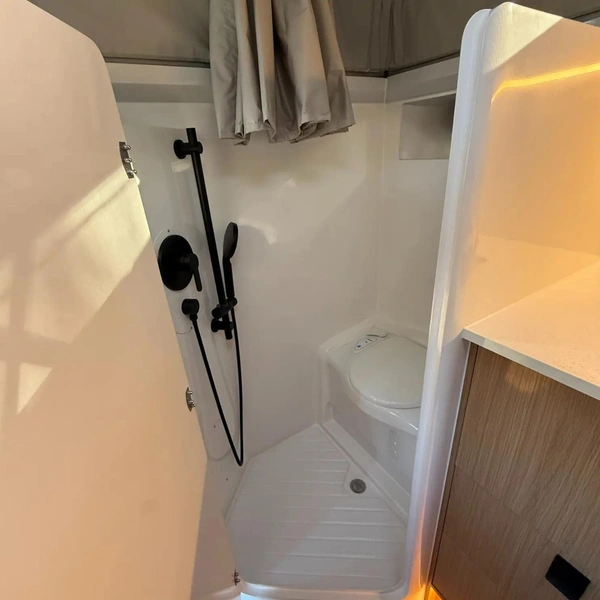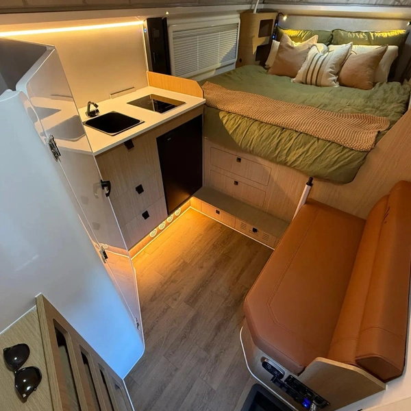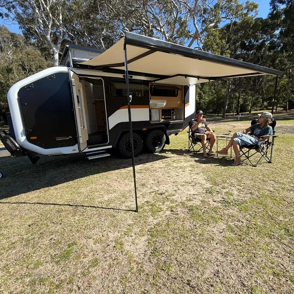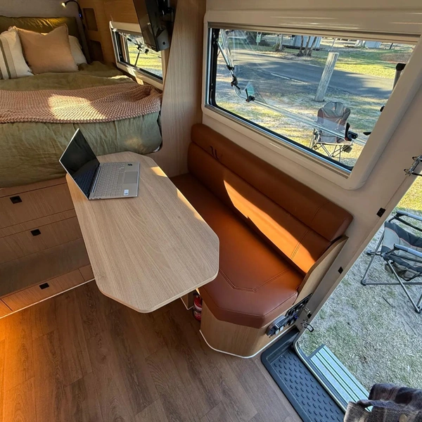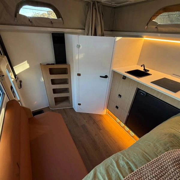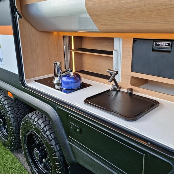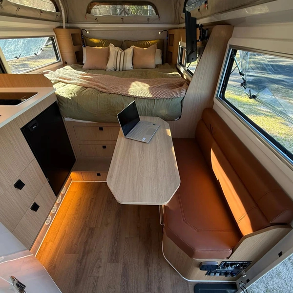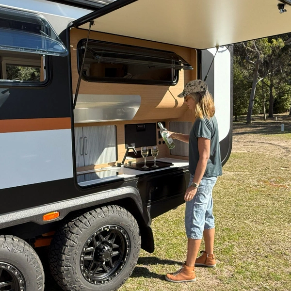 Кемпер оснащен оцинкованным стальным шасси и 29-миллиметровыми композитными панелями с алюминиевой внешней обшивкой и внутренней обшивкой из стекловолокна — все это защищает от капризов австралийской погоды крышу, стены и пол. Внутри — интеллектуальная система электропитания, включающая инвертор мощностью 3000 ватт, преобразователь тока, зарядку от солнечной батареи на 40 ампер.