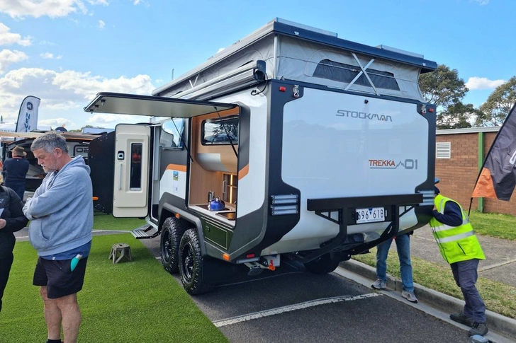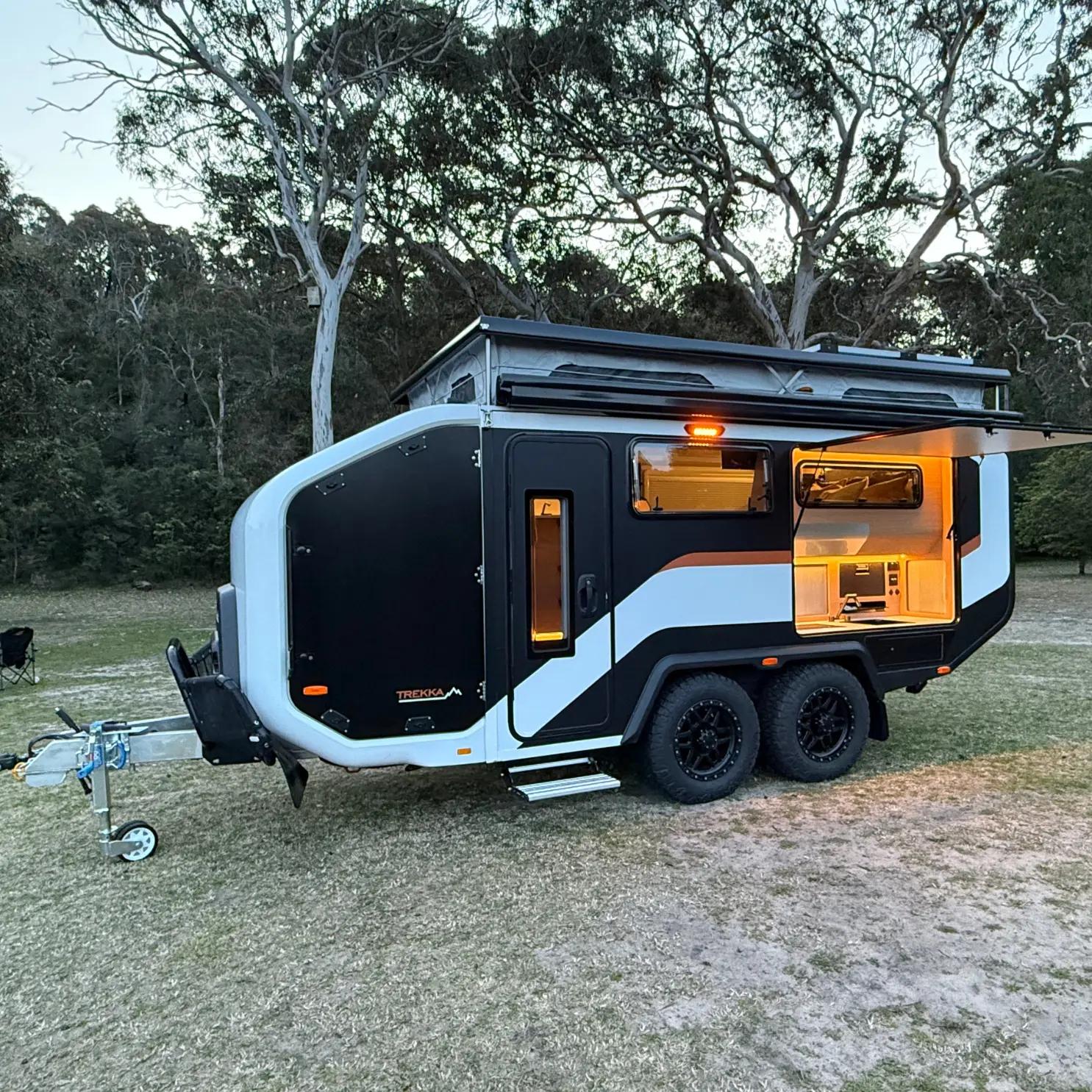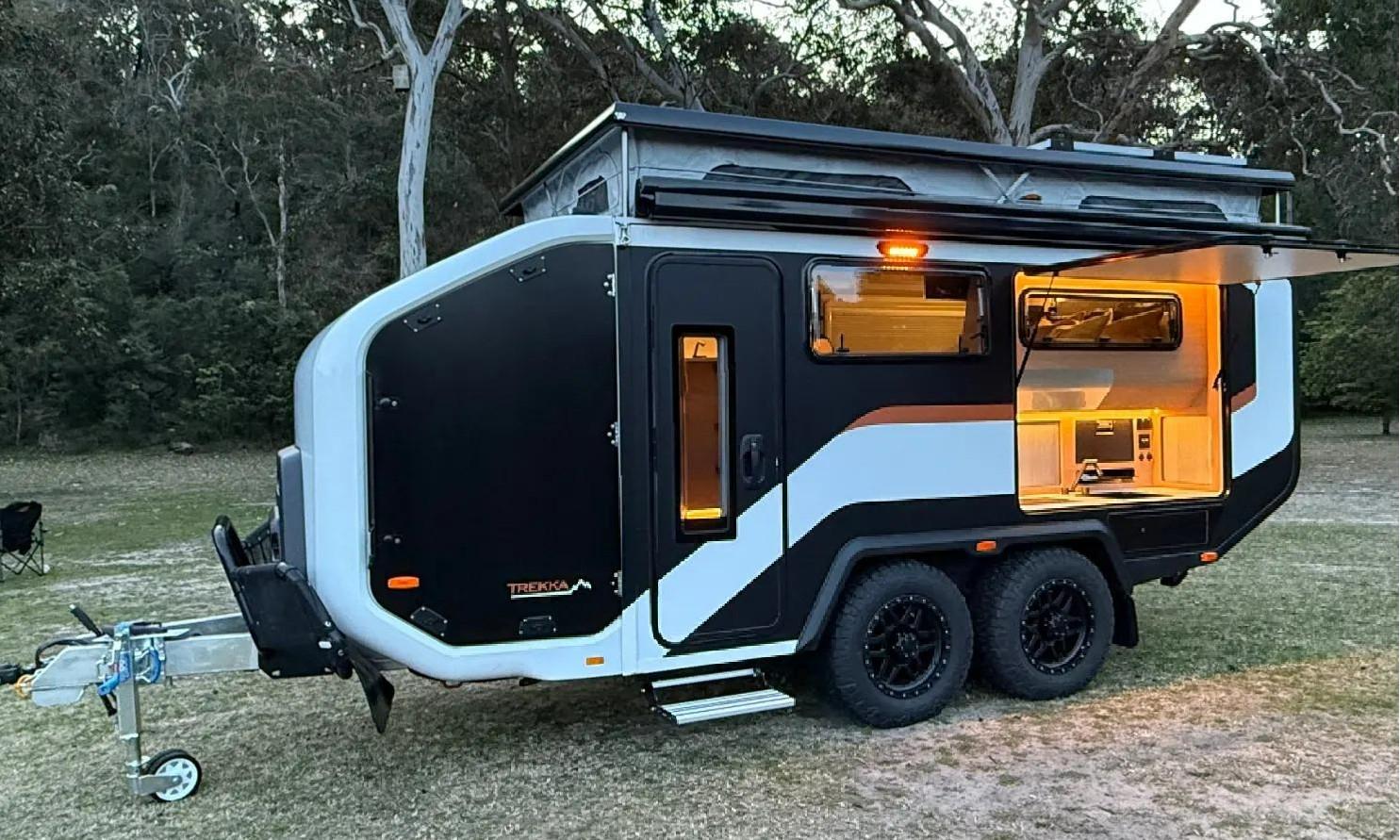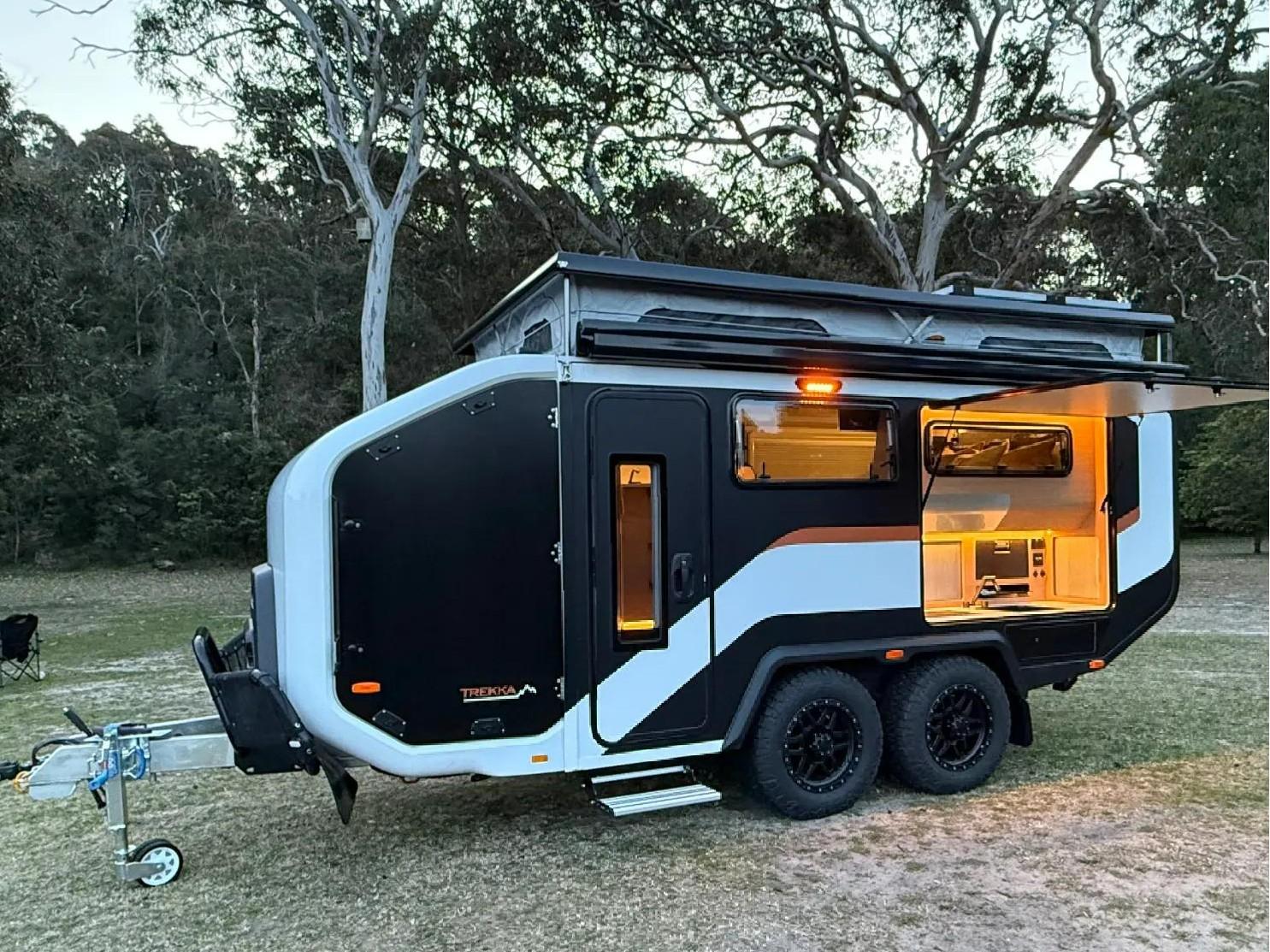 Внутри нашлось место для совмещенного санузла, небольшой кухни с вертикальным холодильником объемом 130 литров, индукционной плиты, мойки, а также трех глубоких ящиков. Есть розетки на 12 и 240 вольт для зарядки электровелосипедов и подключения холодильника. Есть у Trekka и уличная кухня с индукционной варочной панелью, раковиной и выдвижным ящиком для столовых приборов.