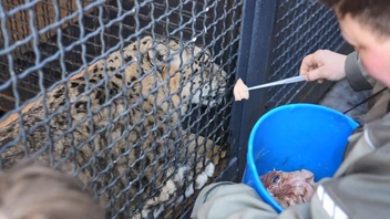 Тренинги проходят так: пока один зоолог производит манипуляции с хвостом, — выбривает небольшой участок и готовит его к забору крови, — другой сотрудник параллельно подкармливает ирбиса лакомствами: хищнику дают кусочки сердца, печени, филе кролика и курятины. Их животное получает в качестве положительного подкрепления за успешно выполненное задание.