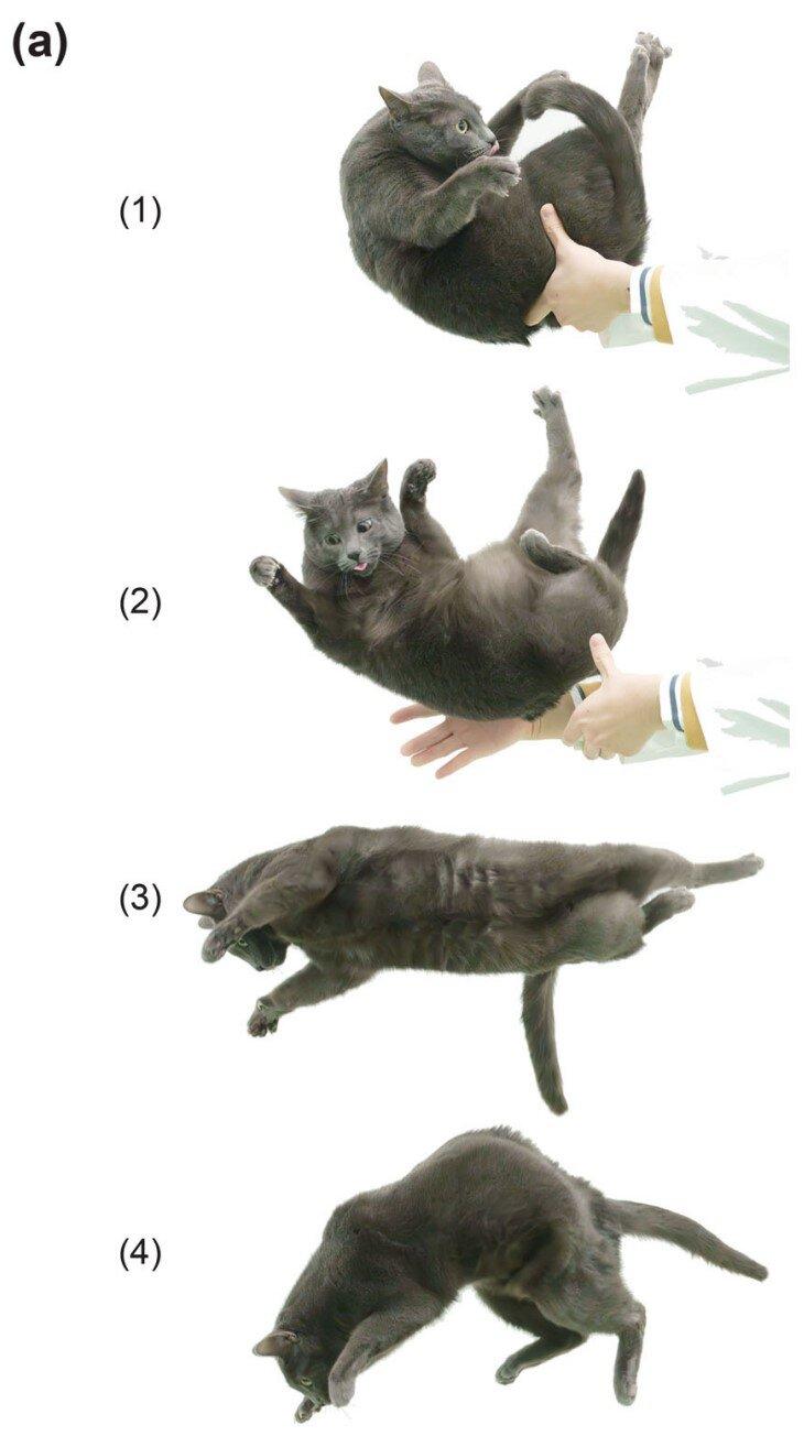Команда исследователей также использовала высокоскоростные камеры, чтобы снять на видео двух здоровых кошек, падающих на мягкую подстилку. Они надели на кошек маркеры на плечах и бедрах, чтобы отслеживать движение частей тела.