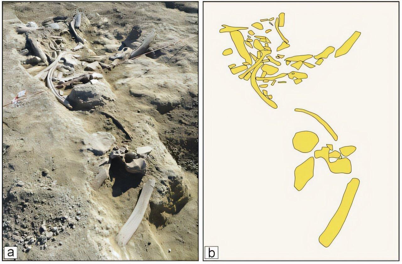 Люди, бродящие по местности небольшими группами, естественно, не могли пройти мимо этой горы мяса. Хотя на костях слона нет характерных следов от разделки и снятия филе, на них есть следы от ударов молотком, и они были найдены рядом с несколькими небольшими кремневыми орудиями.