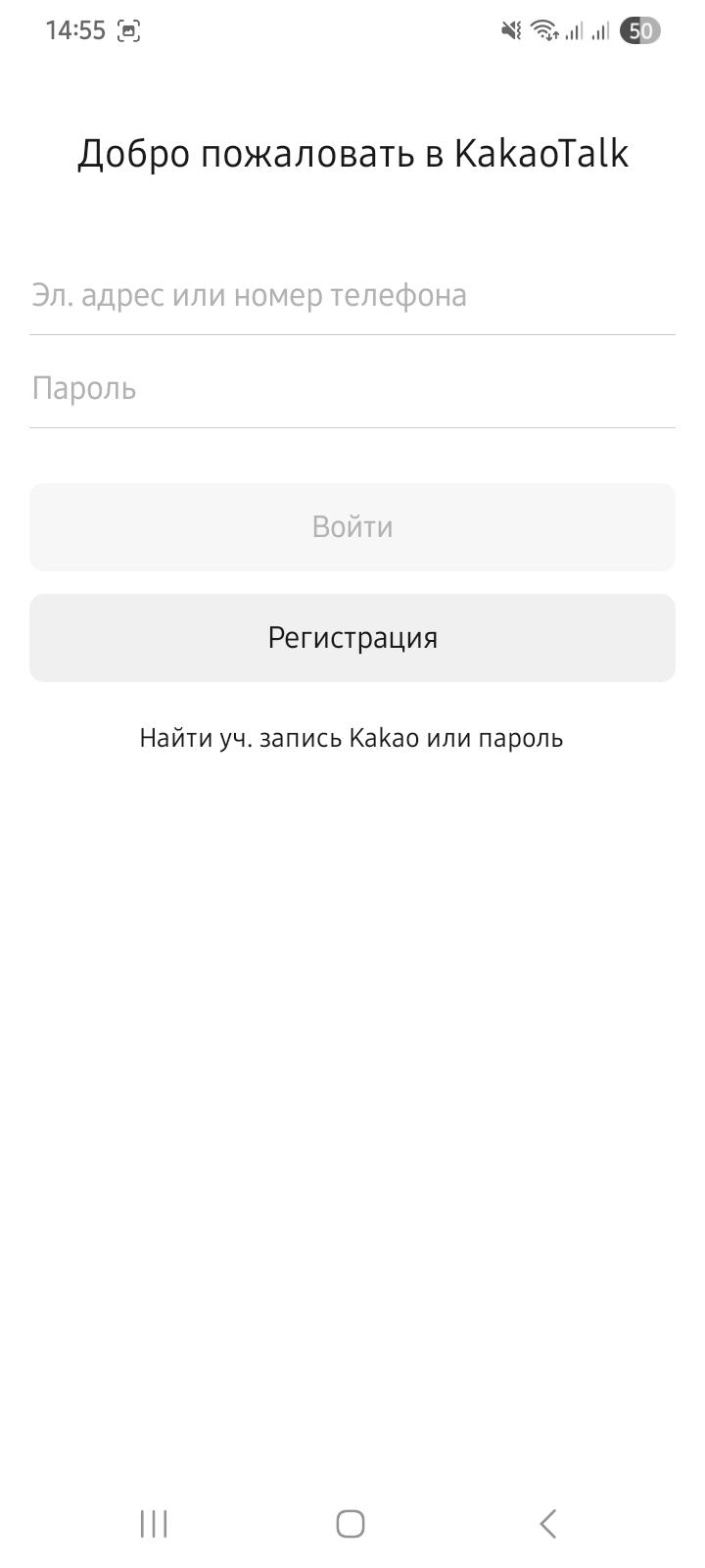 Найти и скачать KakaoTalk у нас получилось без проблем. В Google Play он есть, скорость скачивания была обычной (высокой). На первом экране после установки пользователь видит стандартную приветственную запись на русском языке. Есть возможность войти или зарегистрироваться, выбираем второе.