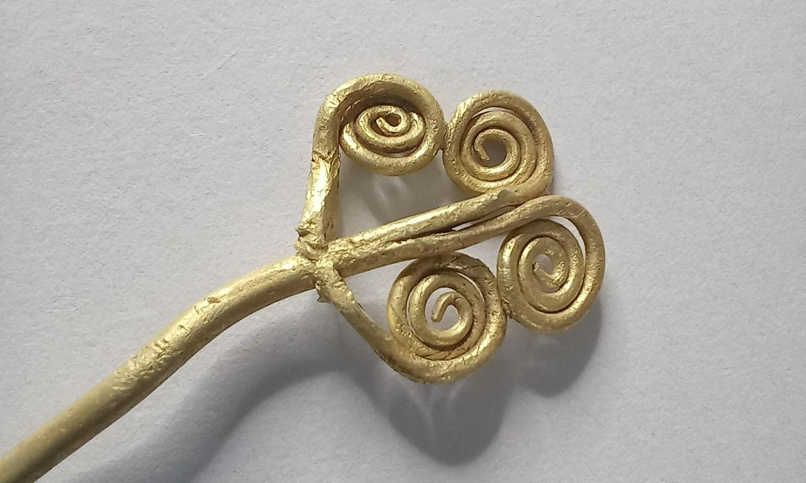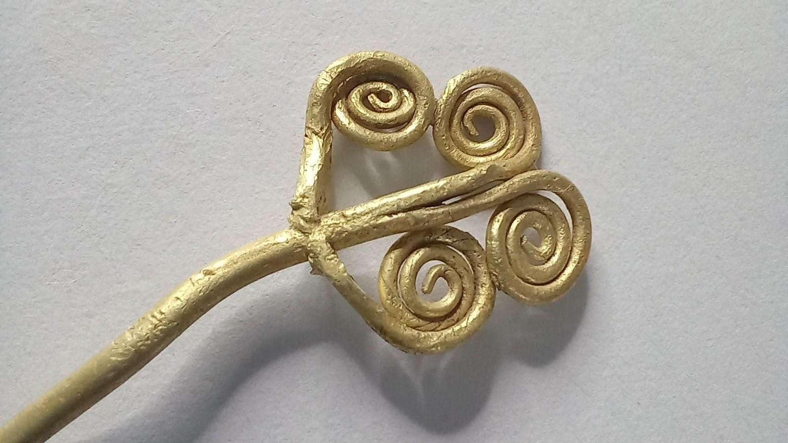 Это уникальная находка, поскольку в мире известны лишь два ее аналога. Подобные броши называют кольцеобразными. Ее длина составляет около пяти сантиметров, а с виду она напоминает растение — на верхушке тонкого «стебля» расположены четыре закрученных в спирали «отростка».