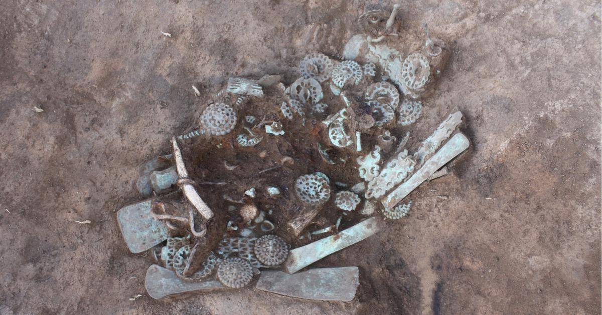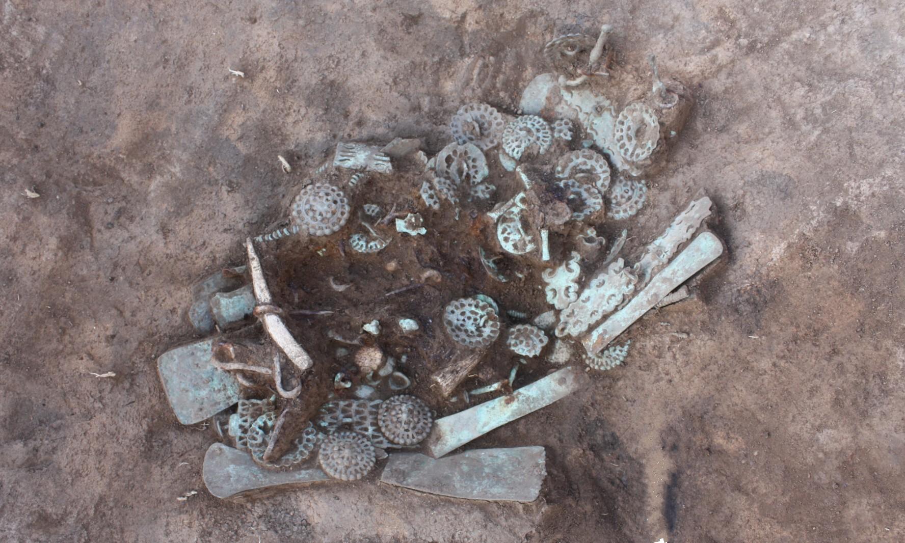 Исследователи из Института археологии РАН провели раскопки между курганами и нашли там несколько скрытых тайников с артефактами. Всего было обнаружено более 100 предметов, связанных преимущественно с конской упряжью, и свыше 500 бронзовых бусин. Но самый впечатляющий комплекс находился в неглубокой круглой яме к западу от одного из курганов.