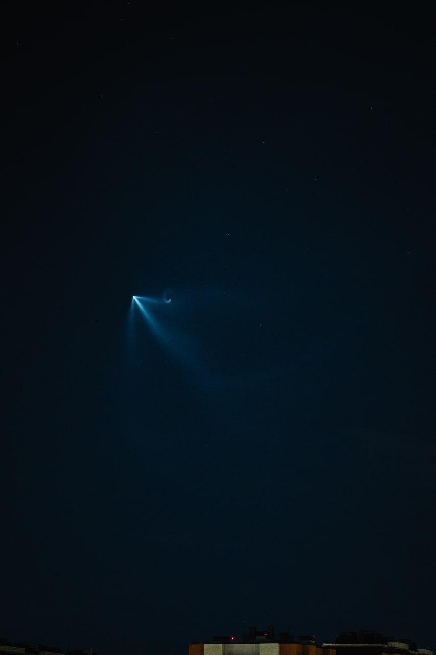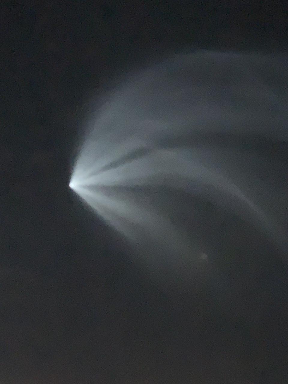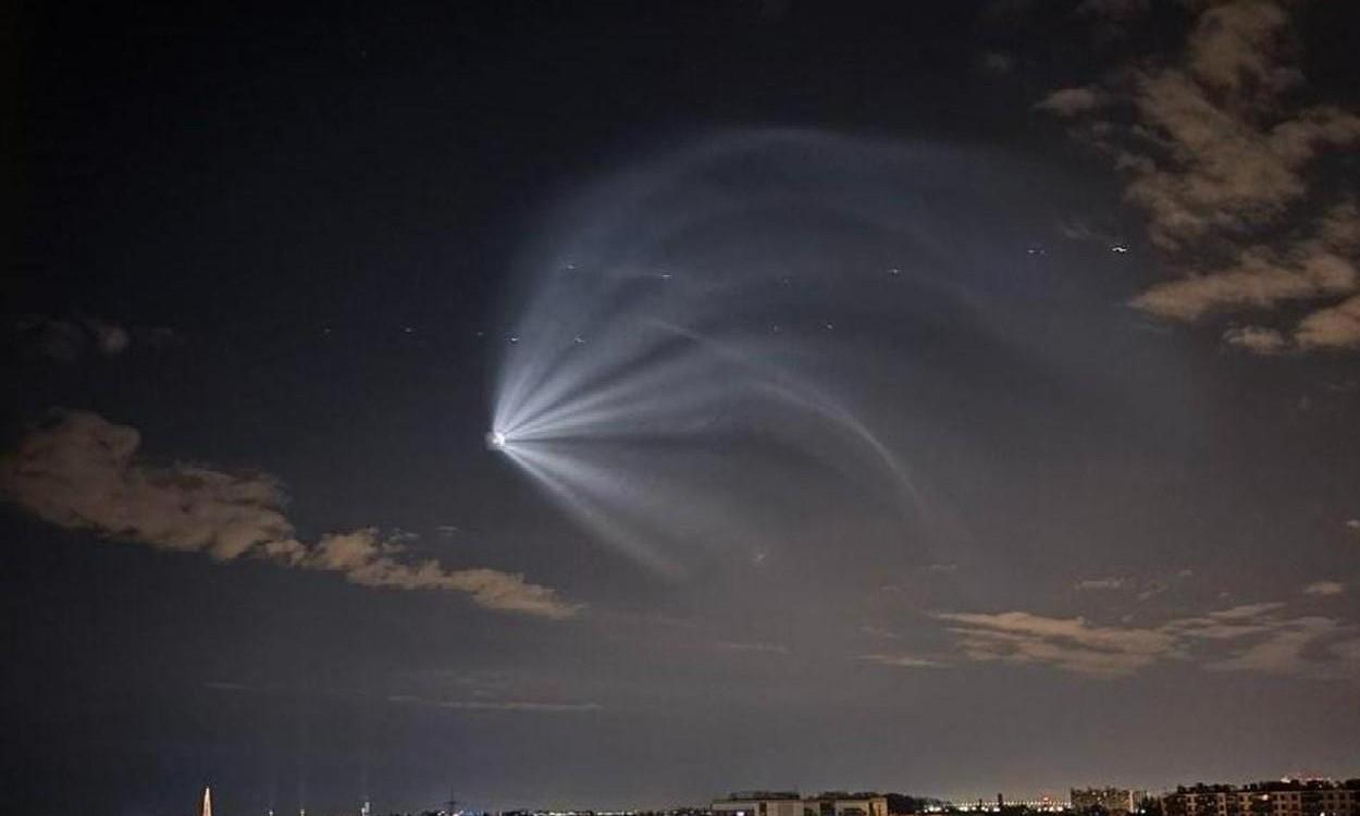 Запуск ракеты выглядит как «медуза» из-за сочетания физики и удачного времени. Во-первых, сама ракета уже находится на огромной высоте, где ее подсвечивает солнце, которое для нас на земле еще (или уже) скрыто за горизонтом.