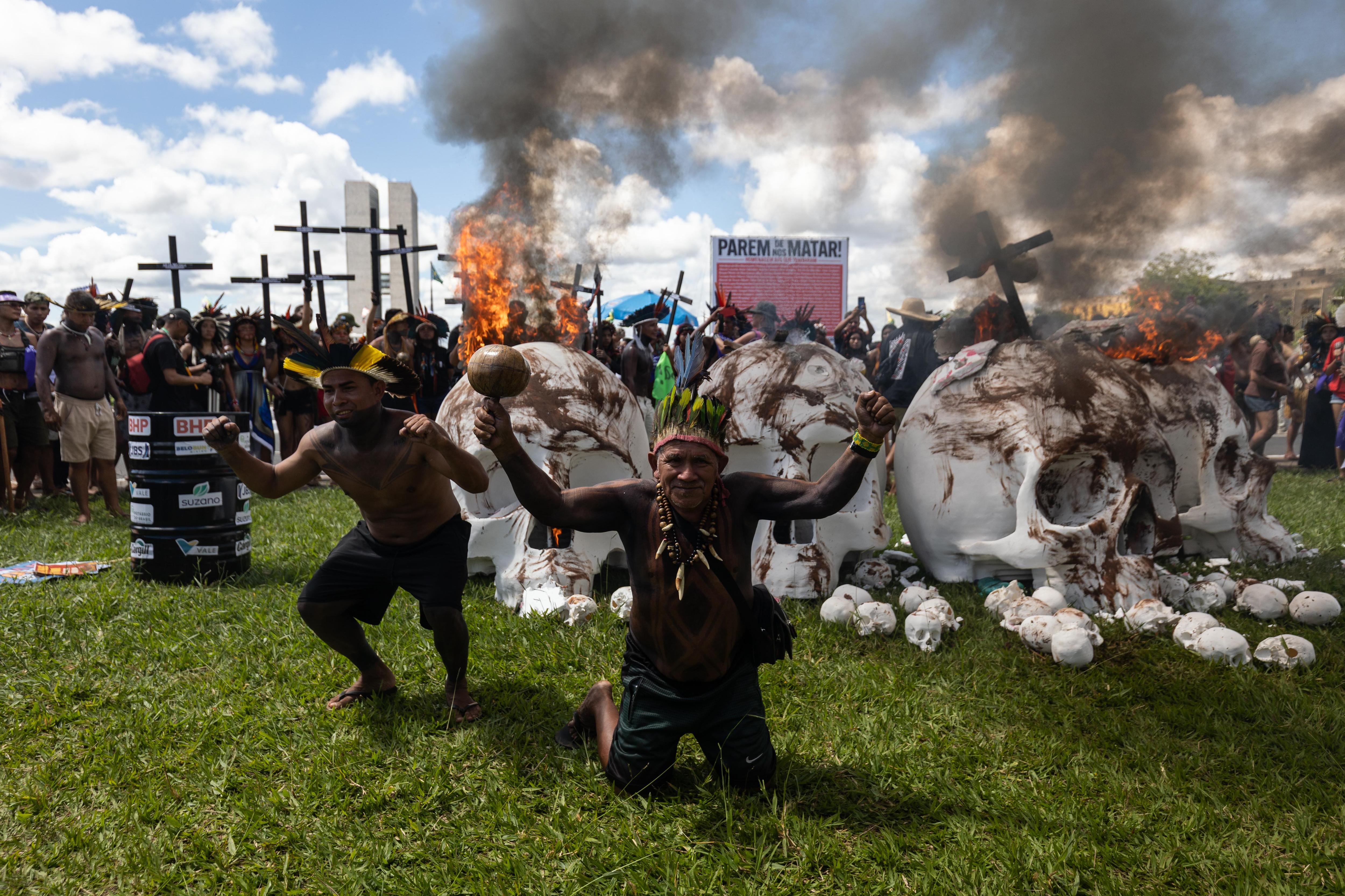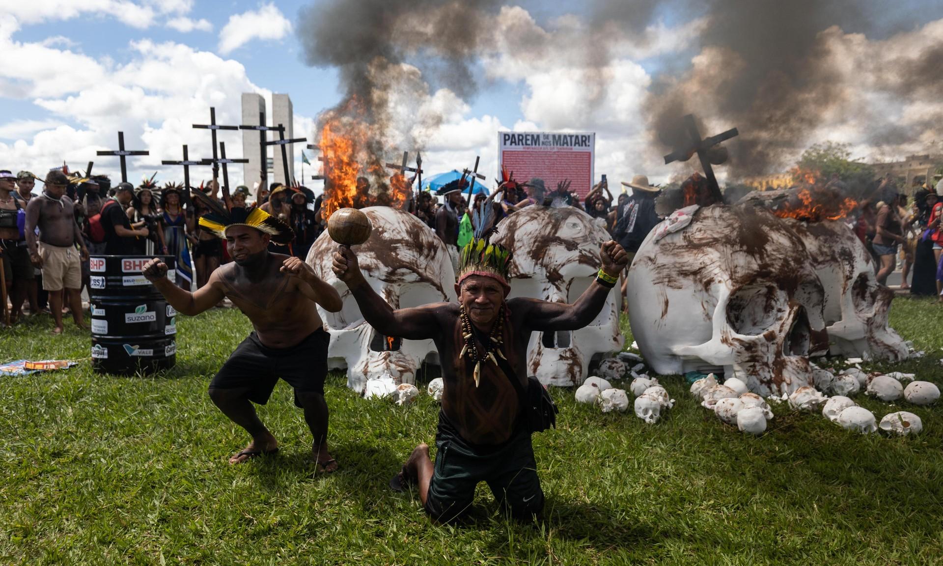 Протестующие прошли по центру столицы Бразилии, города Бразилиа, до разбитого на центральной площади палаточного «Лагеря за свободу земли», где состоялось сожжение моделей гигантских белых черепов. Акция символизировала собой тот ущерб, который наносит жизни коренных народов деятельность корпораций.