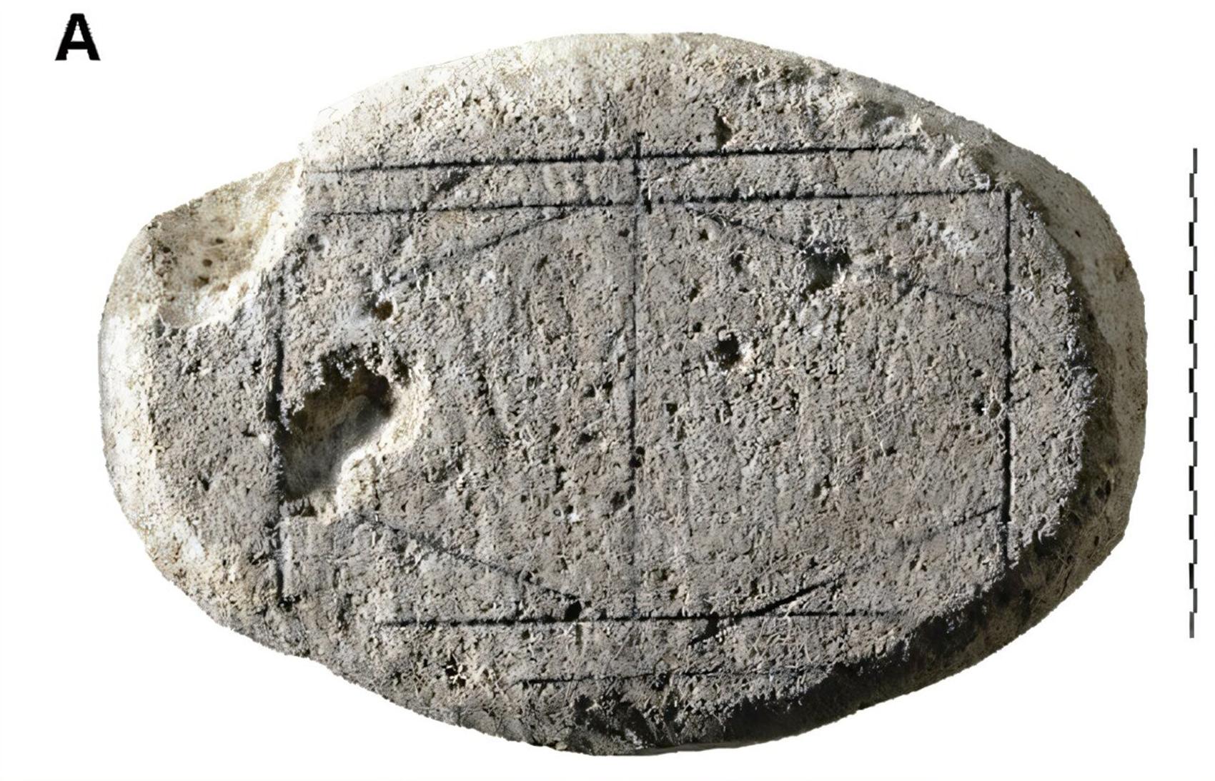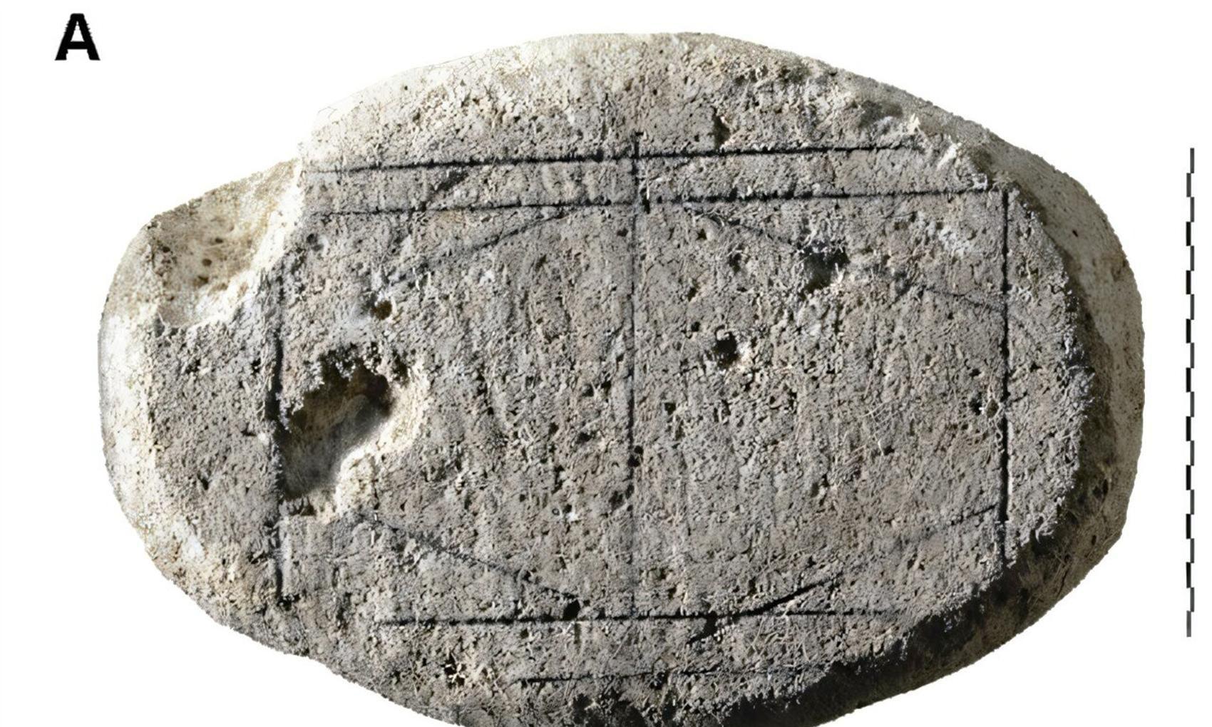 На куске известняка изображен прямоугольник с четырьмя диагональными и одной прямой линиями.