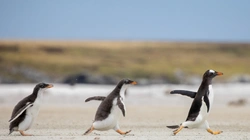 Фолклендские острова. Юные пингвины дружно следуют за родителями, чтобы добыть еду.