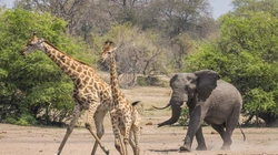 Ботсвана. Юный слон гонится за двумя молодыми жирафами у водоема в заповеднике Машату.