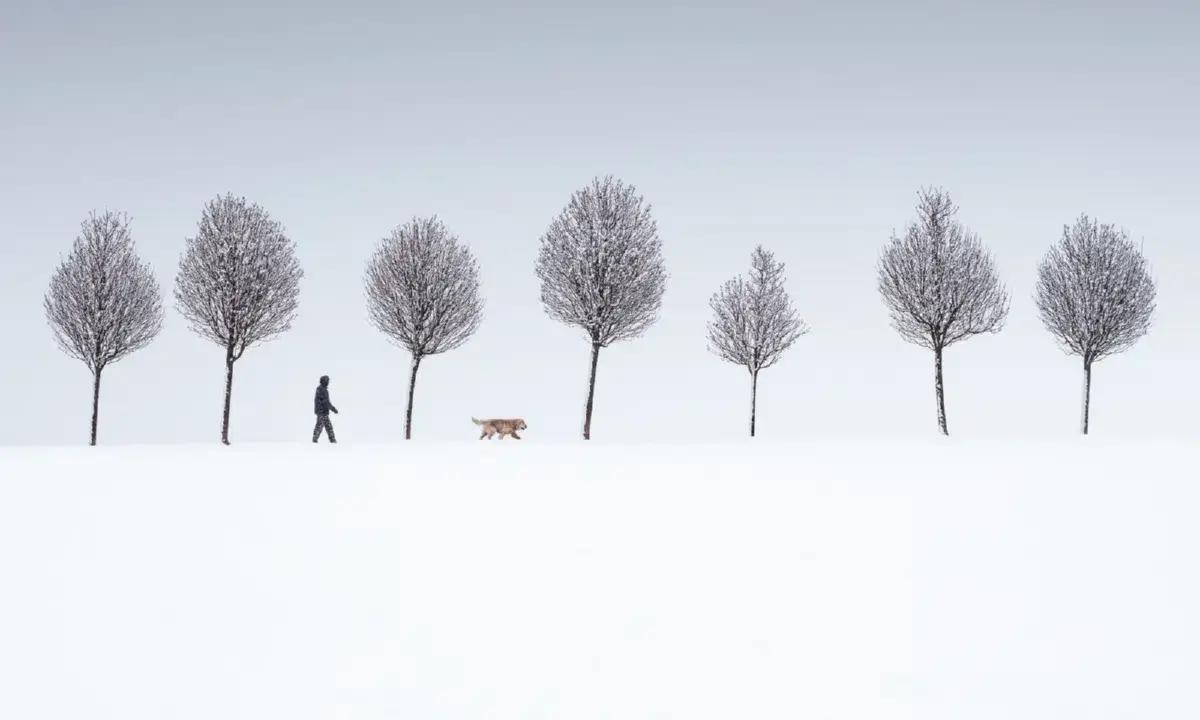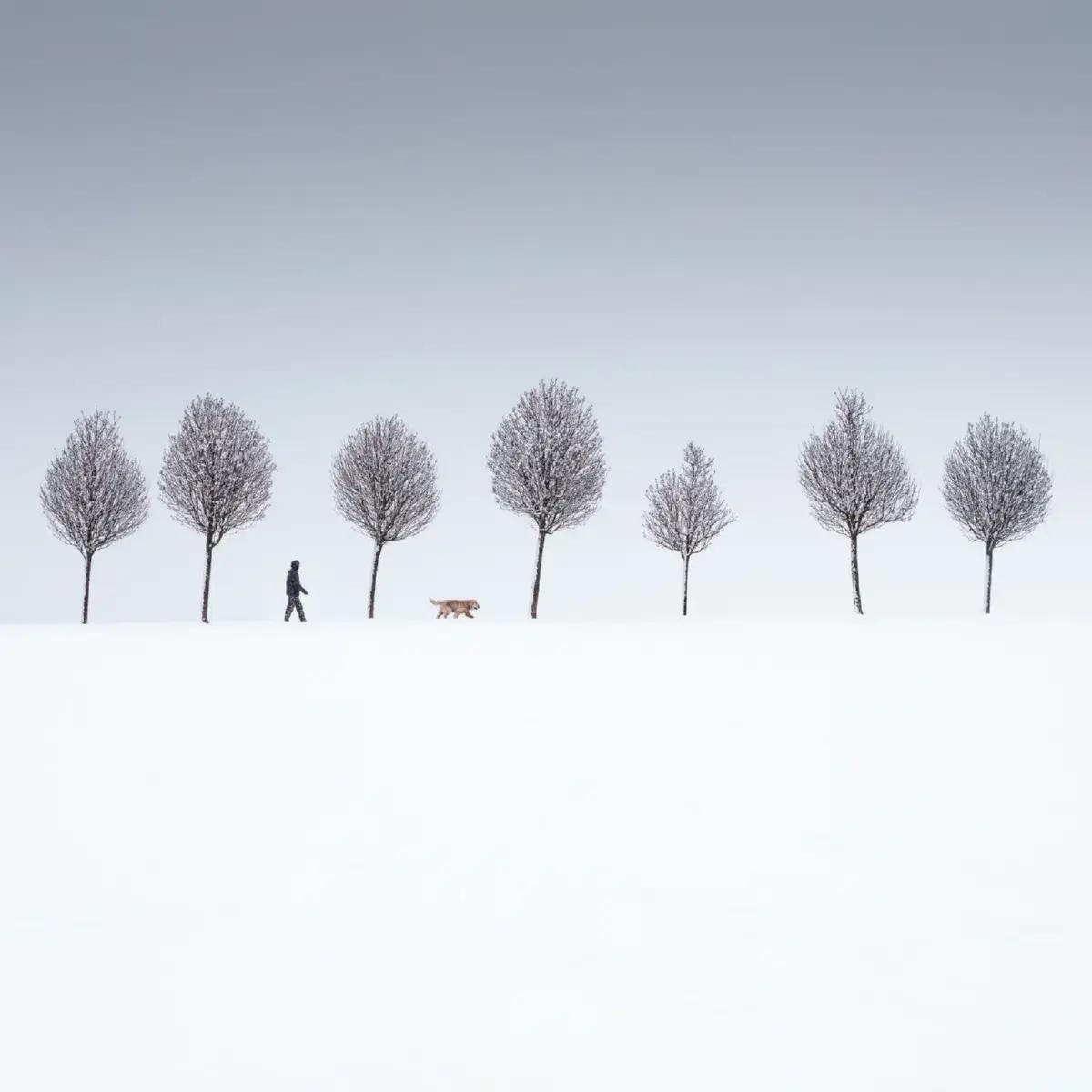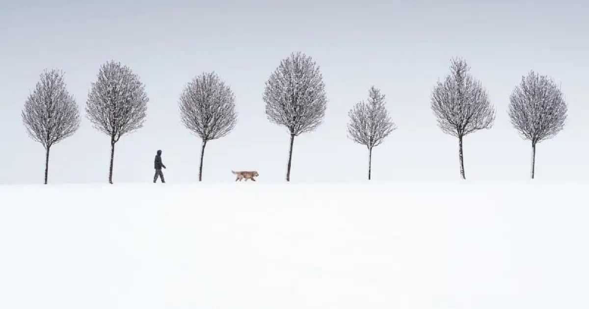В общей сложности на конкурс было подано свыше 7 тысяч работ от фотографов из более чем 50 стран мира. Изучив работы призеров и финалистов, редакция Vokrugsveta.ru выбрала среди них лучшие — знакомить читателей с ними мы начнем с категории «Пейзаж». Заглавным в этой галерее работ финалистов Minimalist Photography Awards 2025 стало фото, удостоенное первого места в номинации. На нем фотограф Мартин Рак запечатлел зимнюю прогулку с собакой где-то на севере Чехии.