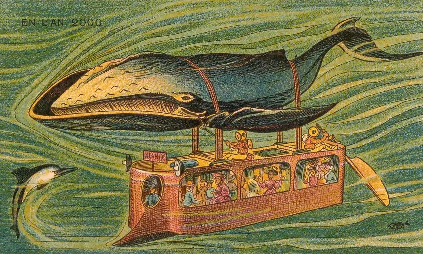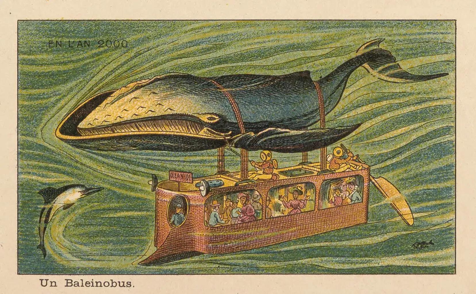 Что-то художники угадали поразительно точно: автоматические инкубаторы, механизированный пошив одежды, электронную музыку. Правда, фантазия художников не смогла выйти за рамки технологий своего времени — отсюда пропеллеры на всем подряд и дамы в корсетах, играющие в подводный крокет. Но самое безумное — это морские сюжеты: гвардейцы верхом на гиппопотамах, а пассажиры на китовом автобусе.