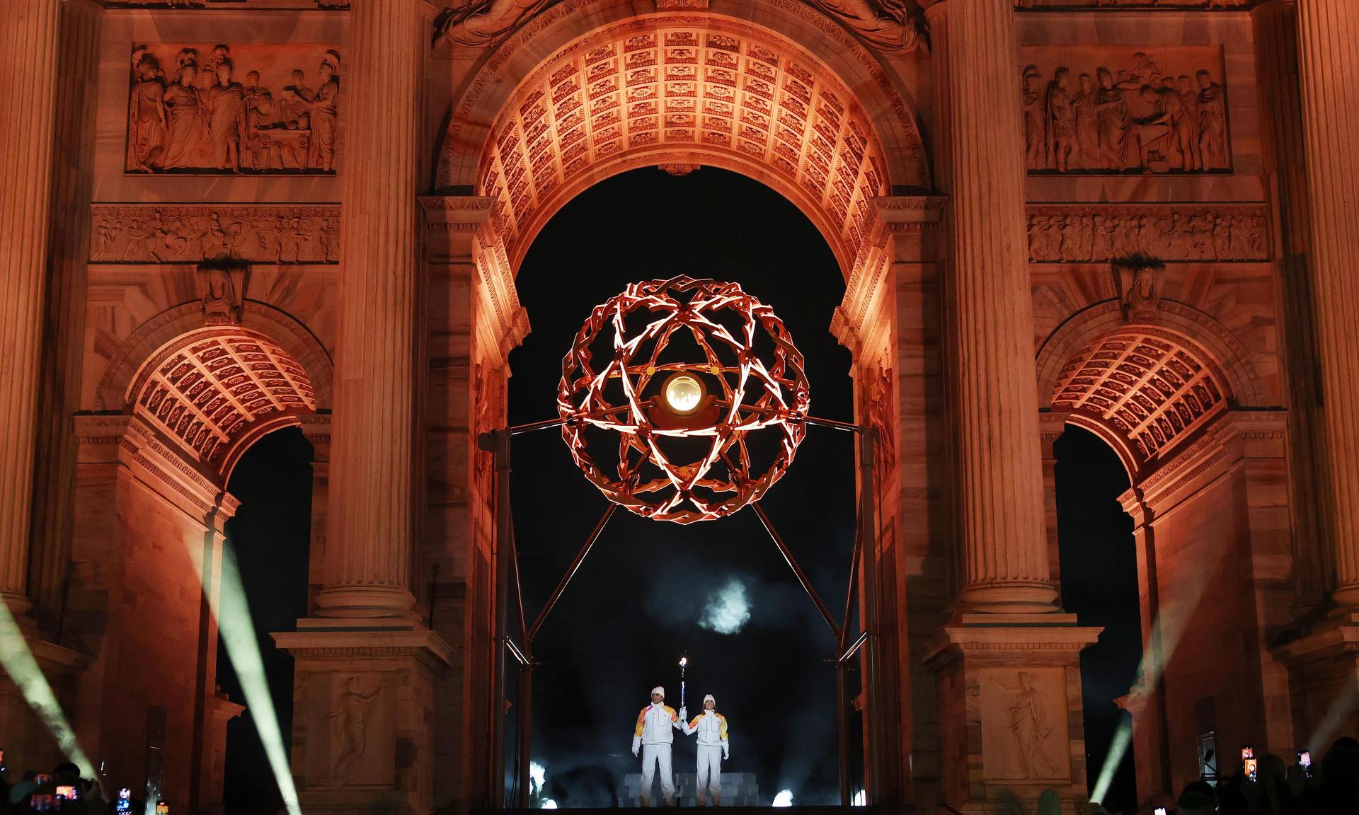 Олимпийский флаг на стадион вынесли несколько спортсменов и общественных деятелей, включая двукратного олимпийского чемпиона по легкой атлетике Элиуда Кипчоге из Кении и двукратную олимпийскую чемпионку по спортивной гимнастике Ребеку Андраде из Бразилии, а олимпийский гимн во время поднятия флага исполнили китайский пианист Лан Лан и итальянская певица Чечилия Бартоли.